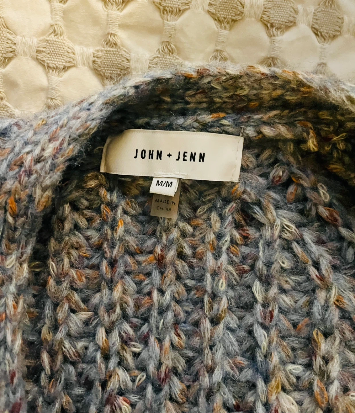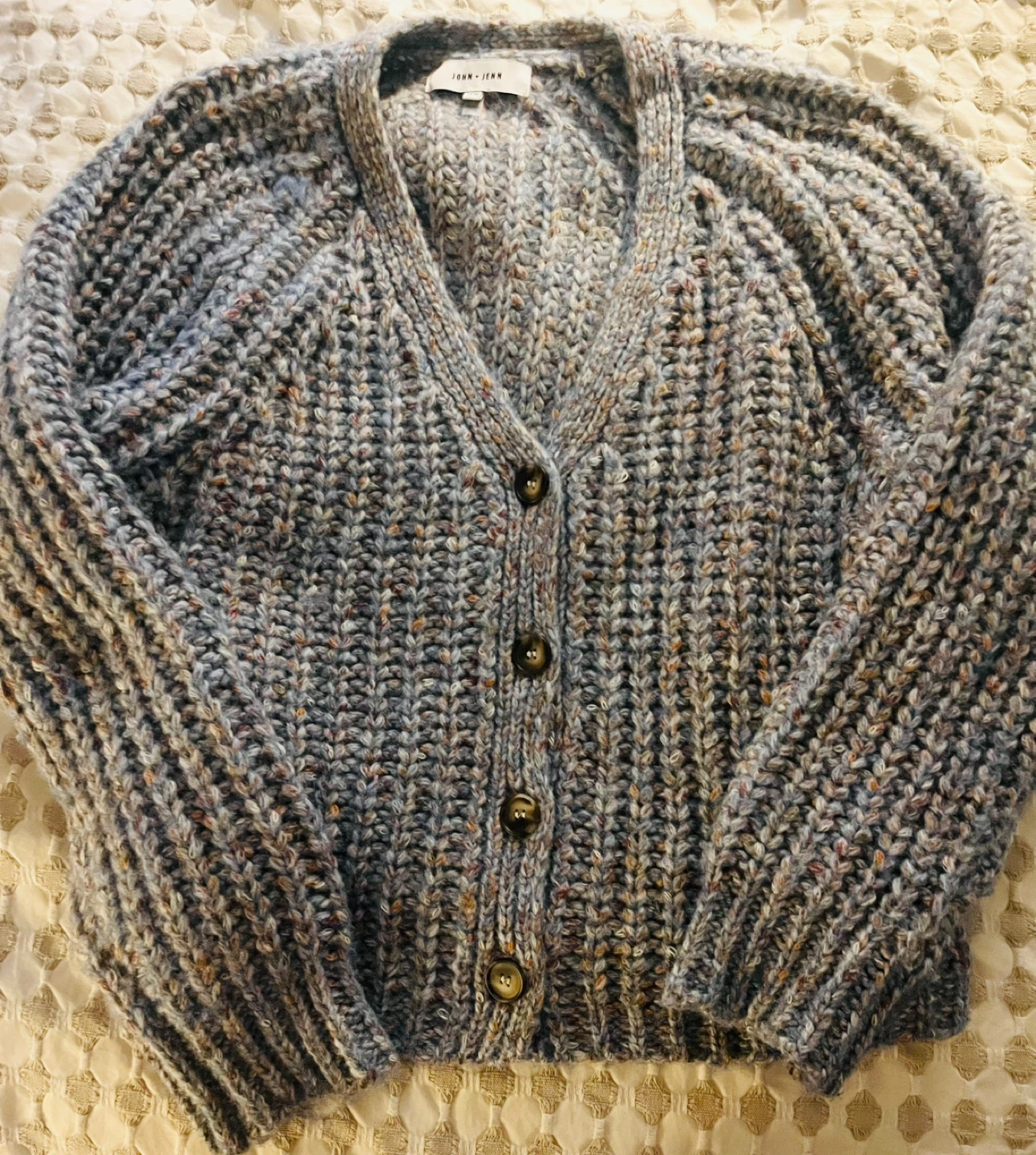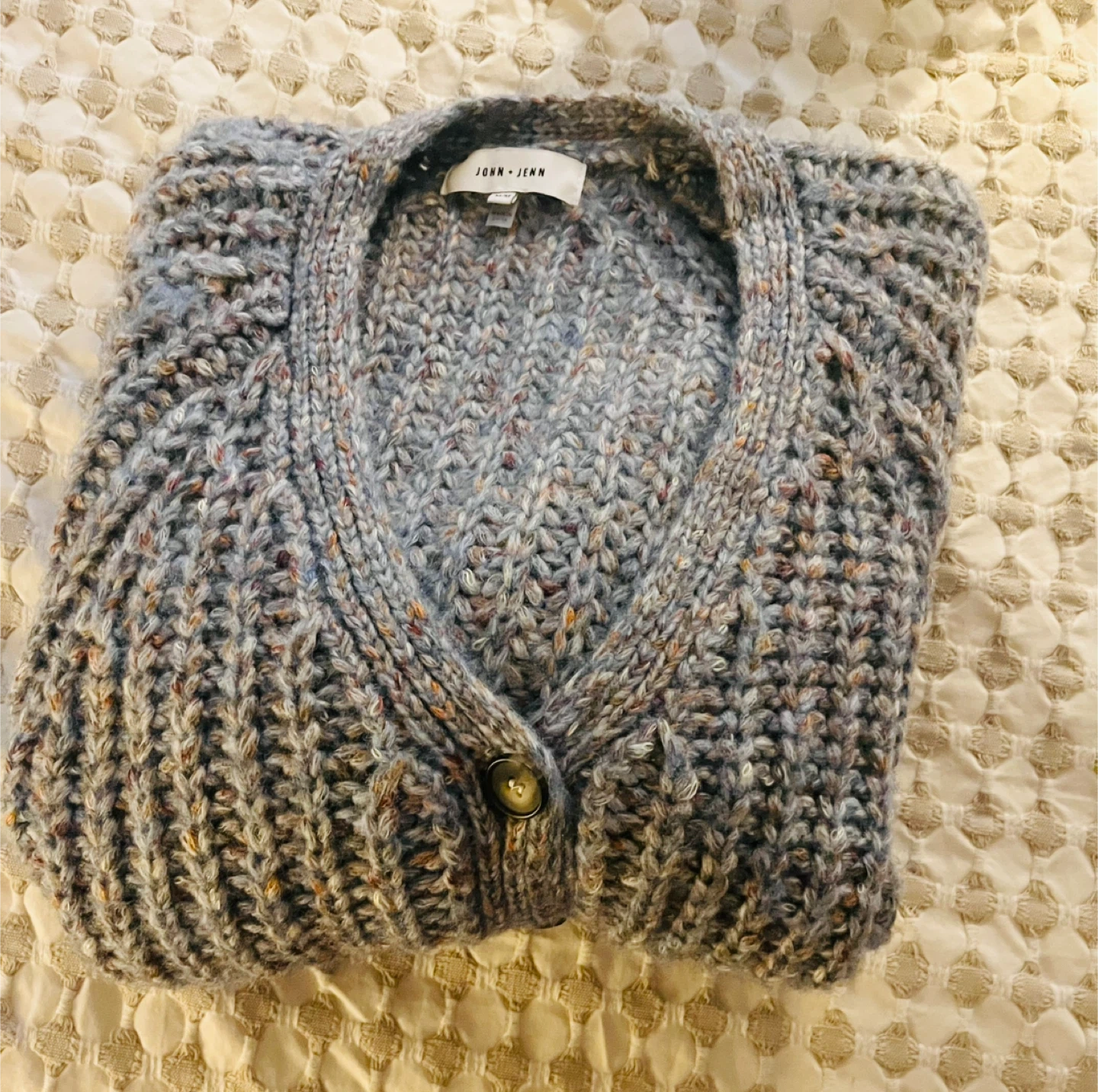 This John + Jenn Hawkins Cardigan features a textured knit in a multicolor "Autumn Sunset" shade. It's a size medium with a button-front closure.