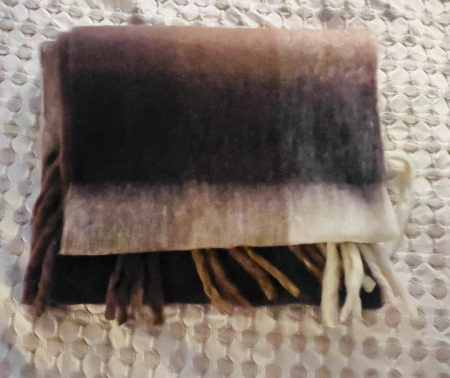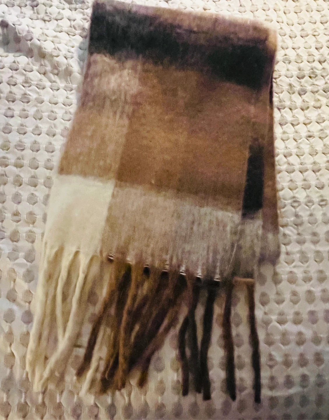Soft, cozy scarf with a plaid pattern and fringe detailing. Neutral brown, cream, and white colorway. Adds warmth and style to any outfit.