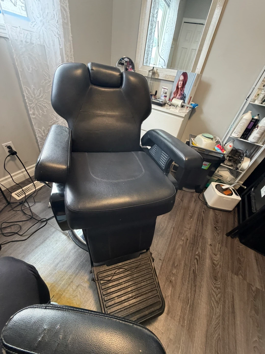 This is a sturdy black leather barber chair. It's designed for comfort and durability. The chair features adjustable height and a reclining backrest.