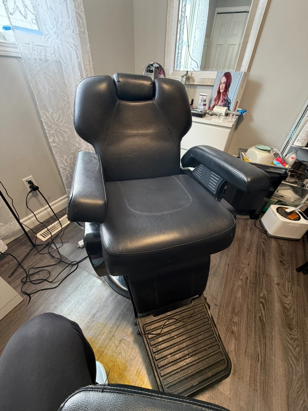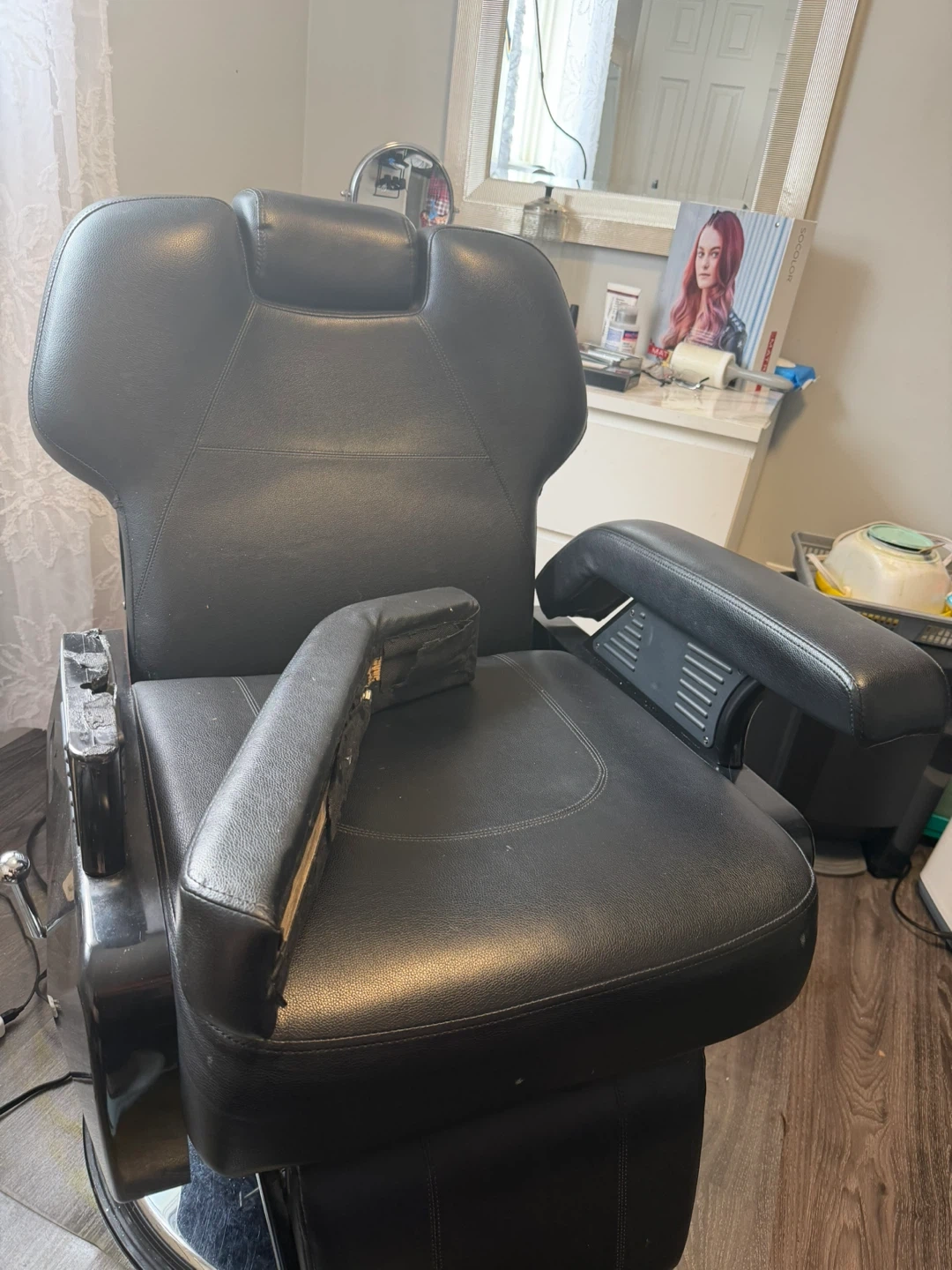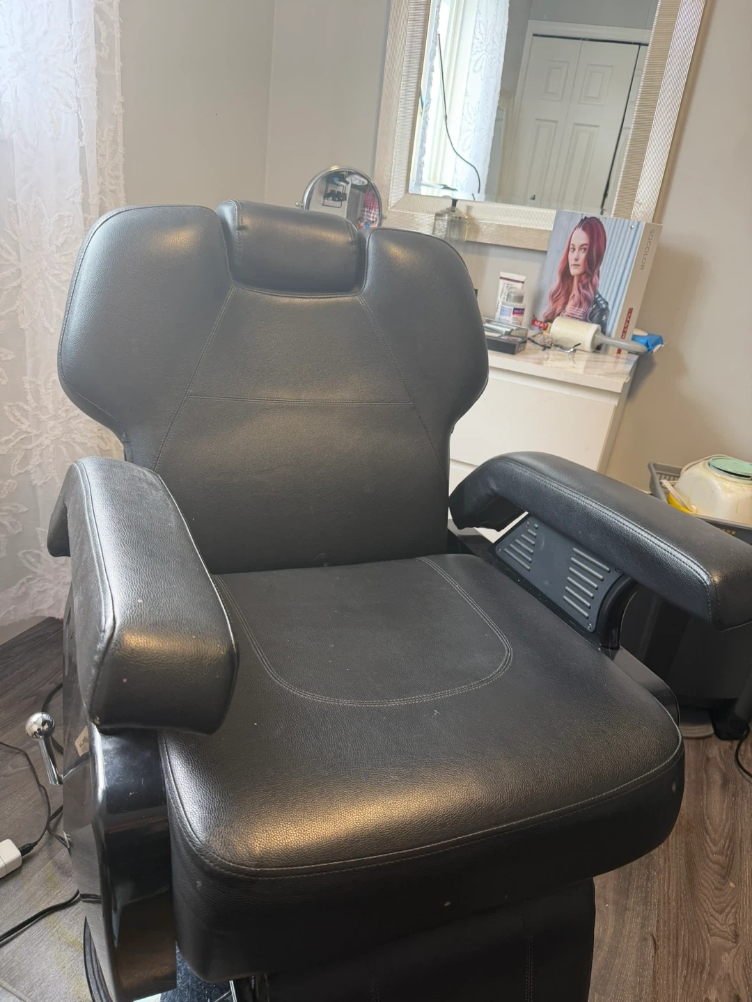 This is a sturdy black leather barber chair. It's designed for comfort and durability. The chair features adjustable height and a reclining backrest.