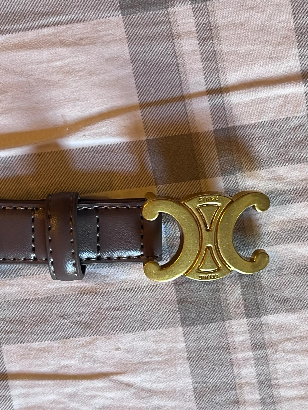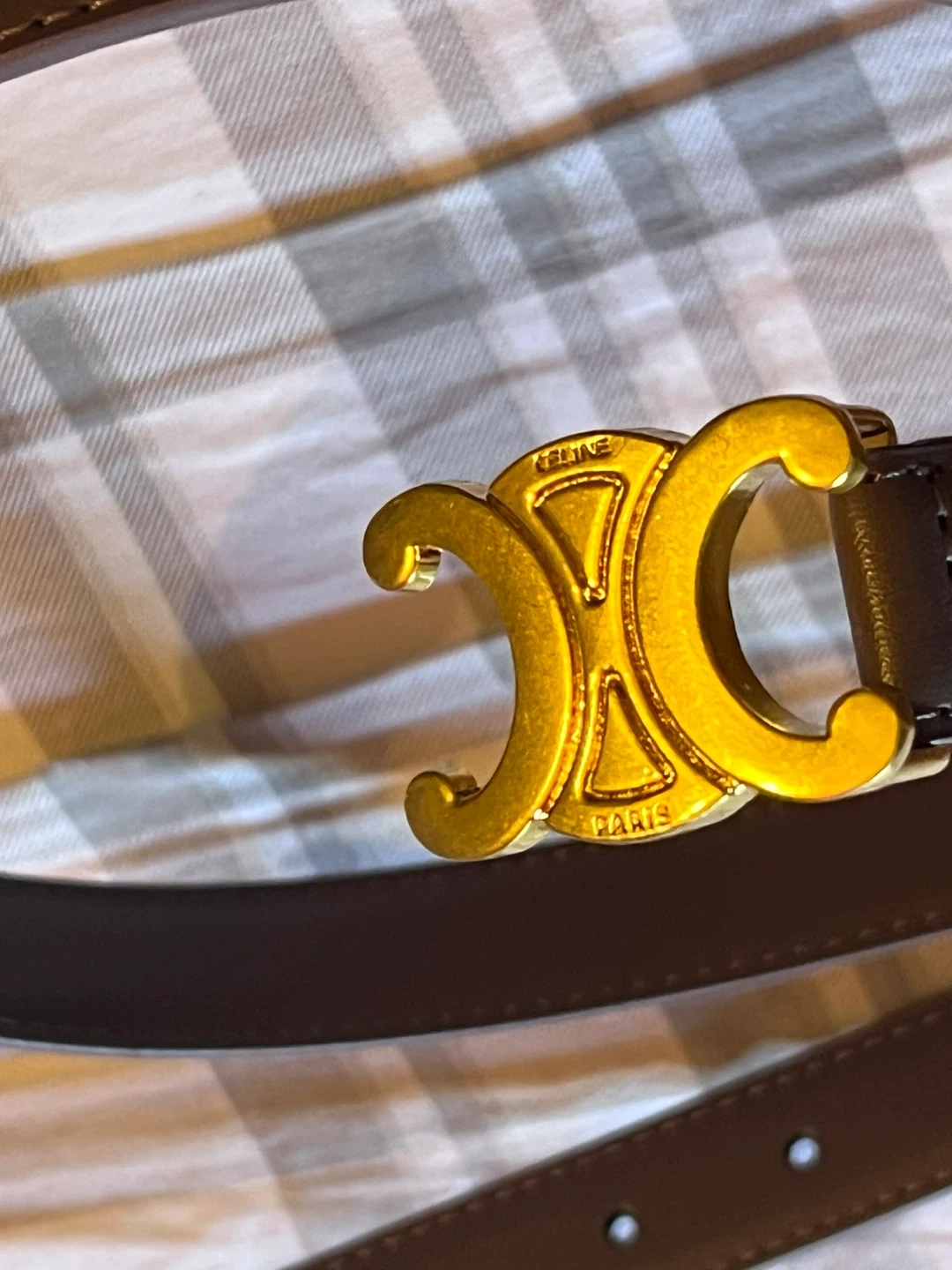 Iconic Celine belt with gold Triomphe buckle. Features the CELINE PARIS logo on the buckle. The belt is dark brown leather with a classic design.