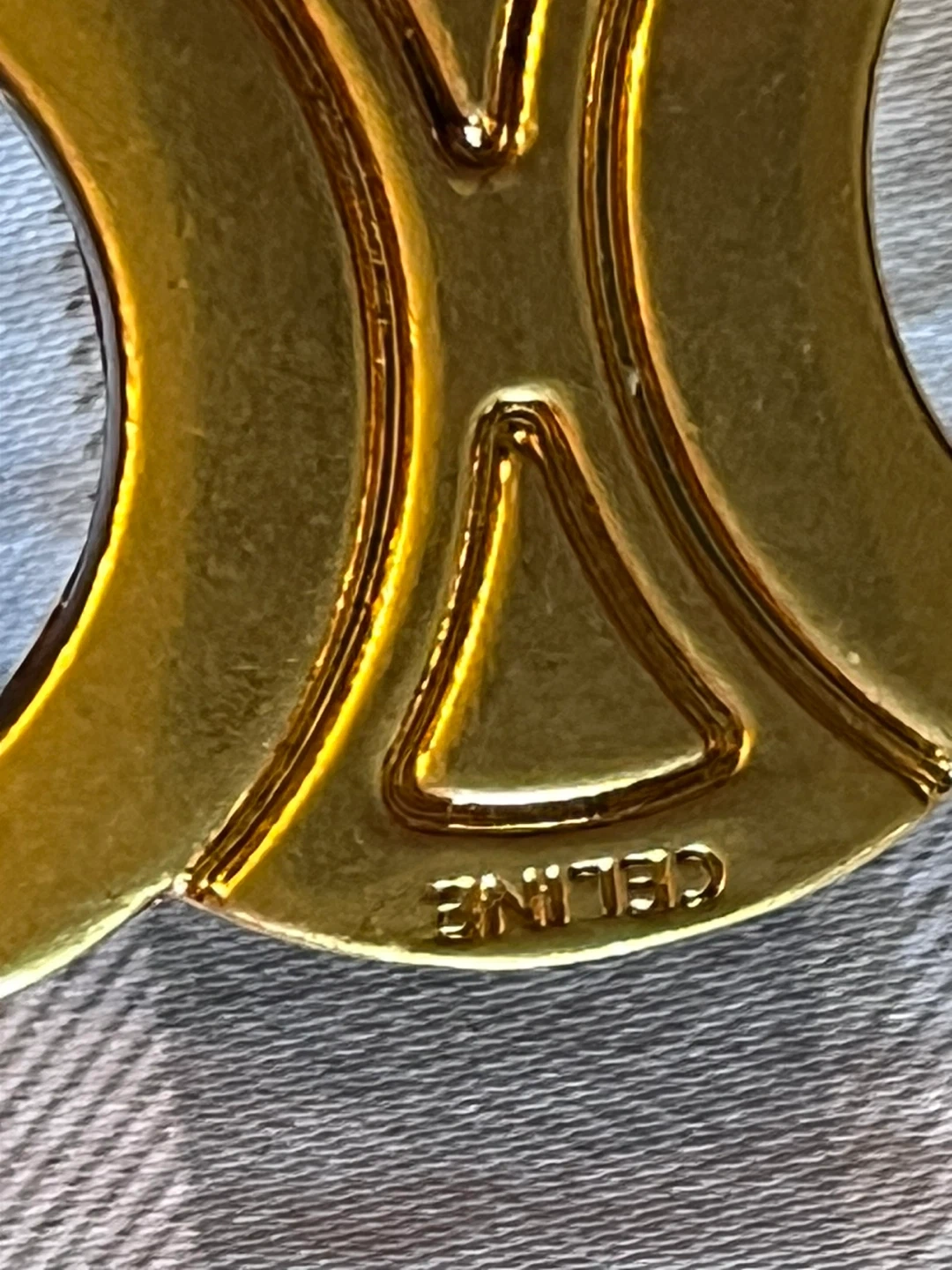 Iconic Celine belt with gold Triomphe buckle. Features the CELINE PARIS logo on the buckle. The belt is dark brown leather with a classic design.