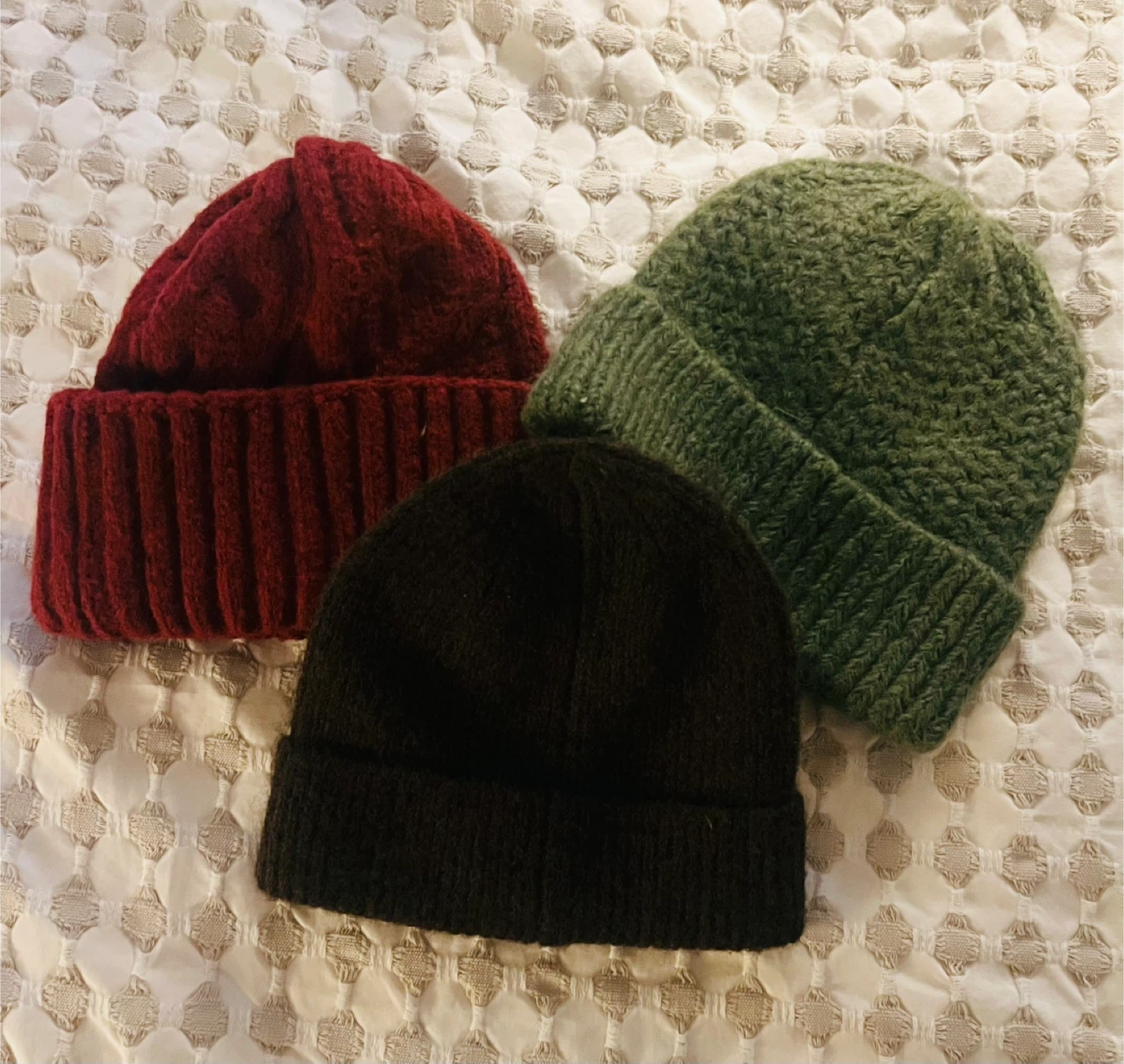 Here's a set of three cozy knit beanies, perfect for keeping warm. Includes one green, one burgundy, and one brown beanie. The ribbed cuffs add a classic touch.