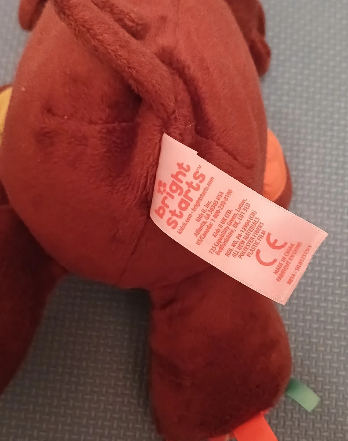 This Bright Starts monkey plush toy is soft and cuddly. It's made with all new polyester fibers and plastic film. The plush has a colourful textured tummy and a small mirror rattle on one arm.