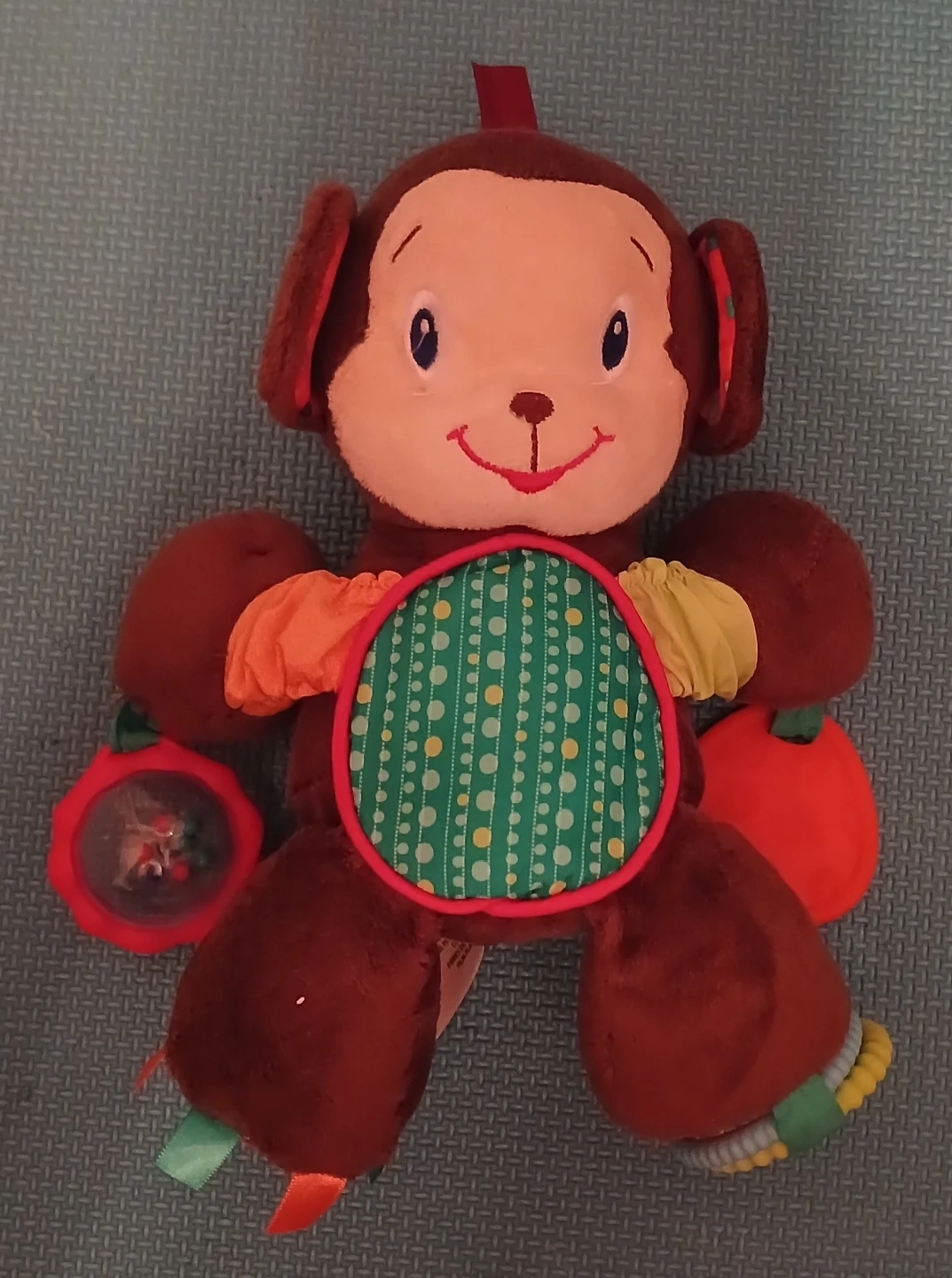 This Bright Starts monkey plush toy is soft and cuddly. It's made with all new polyester fibers and plastic film. The plush has a colourful textured tummy and a small mirror rattle on one arm.