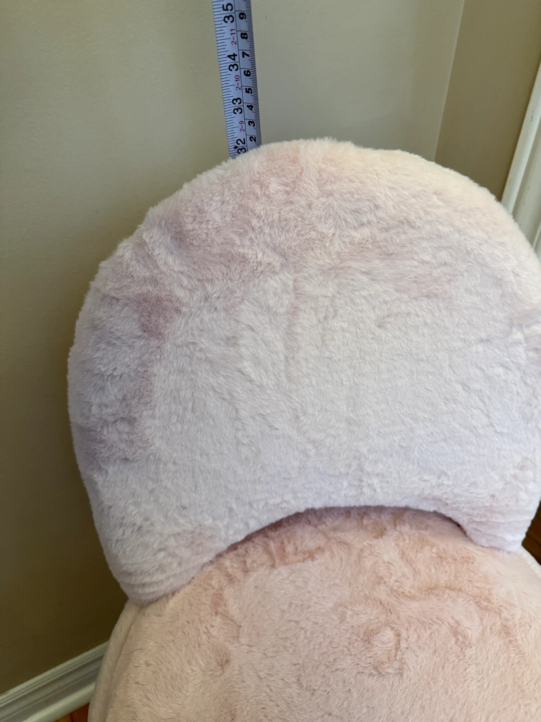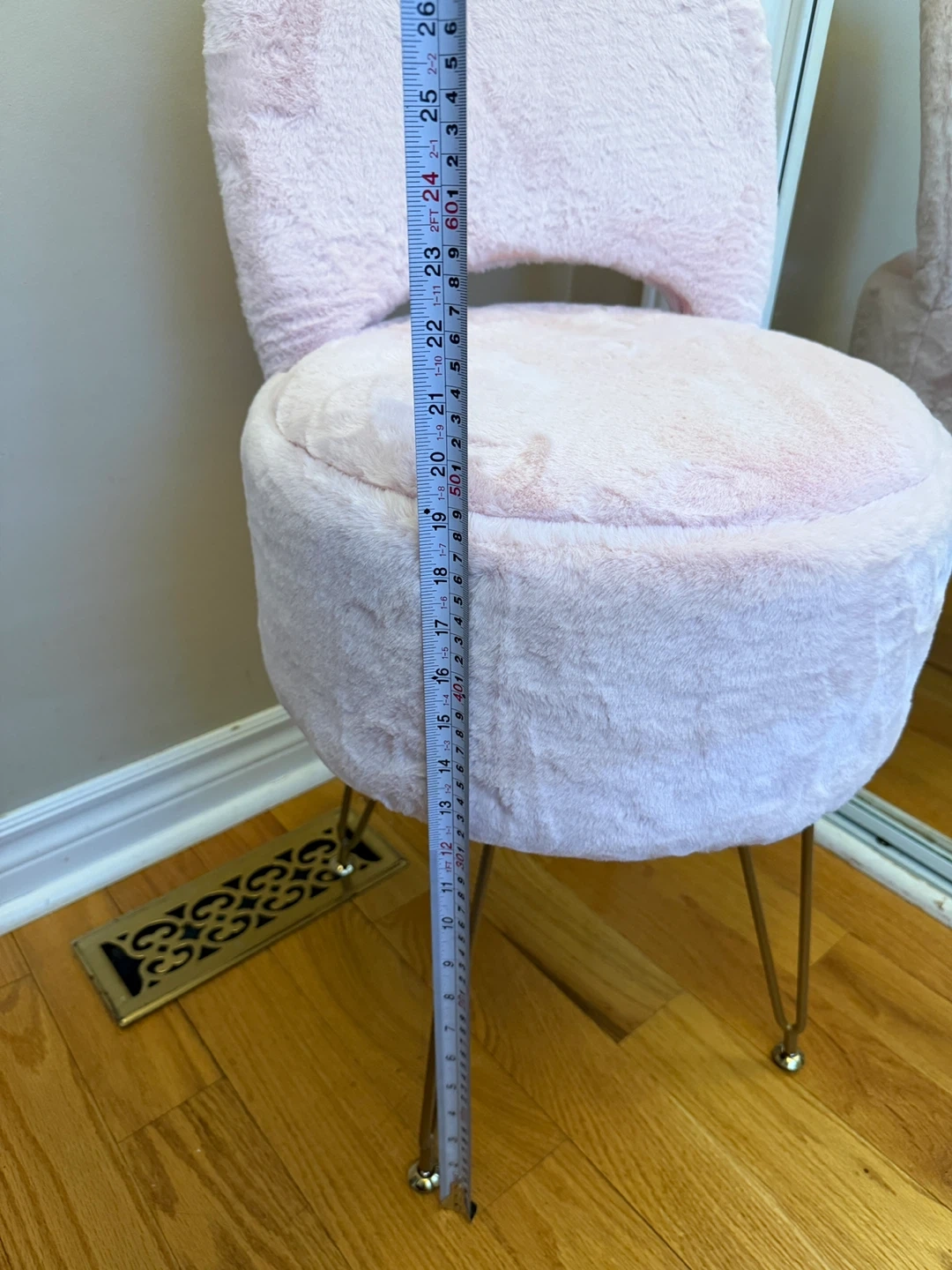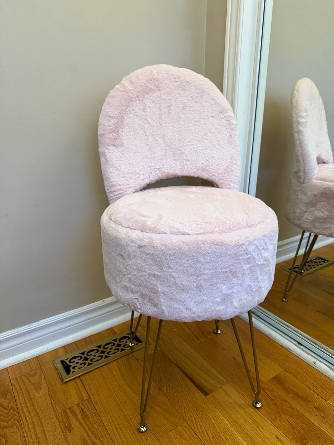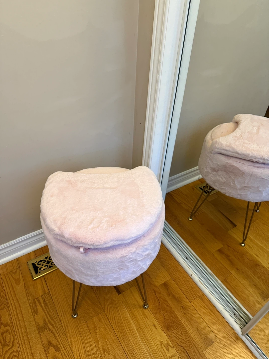 This cute pink vanity stool is covered in soft faux fur and features a convenient storage compartment inside and foldable back.