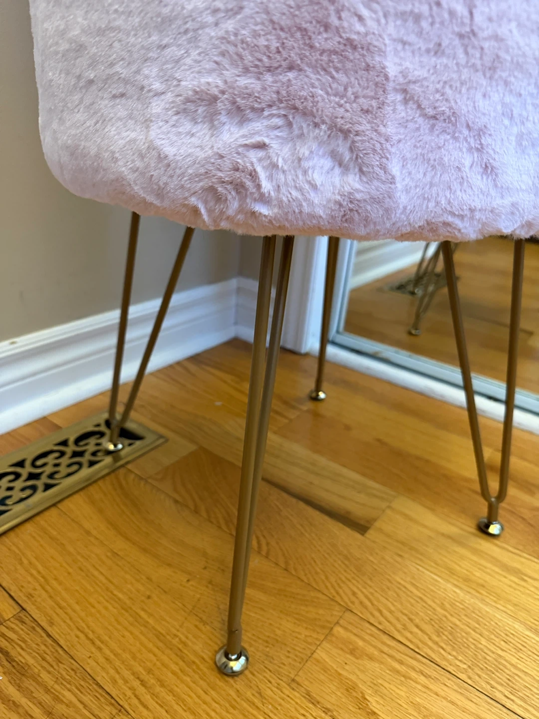 It's supported by gold-toned hairpin legs. It adds a touch of glam to any vanity or bedroom space!