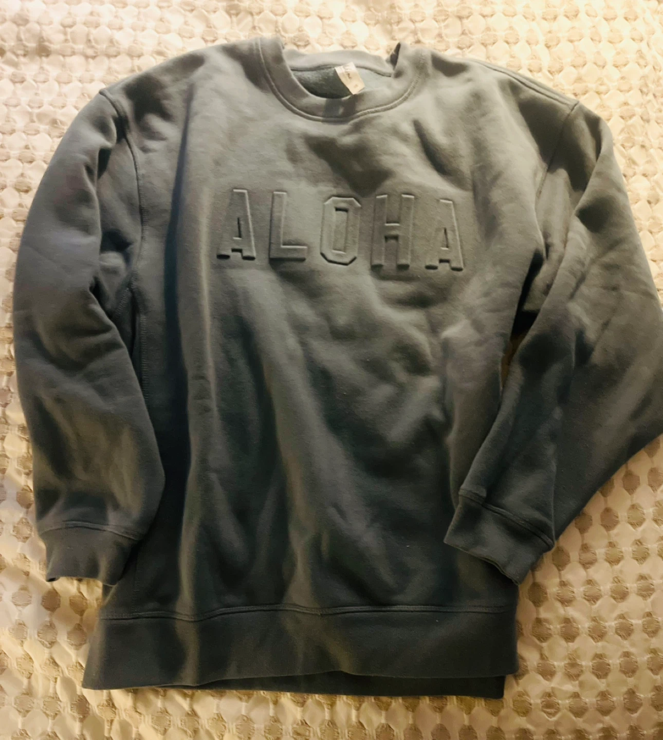 This Mahina sweatshirt features 'ALOHA' embossed on the front. It's a comfortable, one-size-fits-all (OS) piece. Made from soft fabric for casual wear.