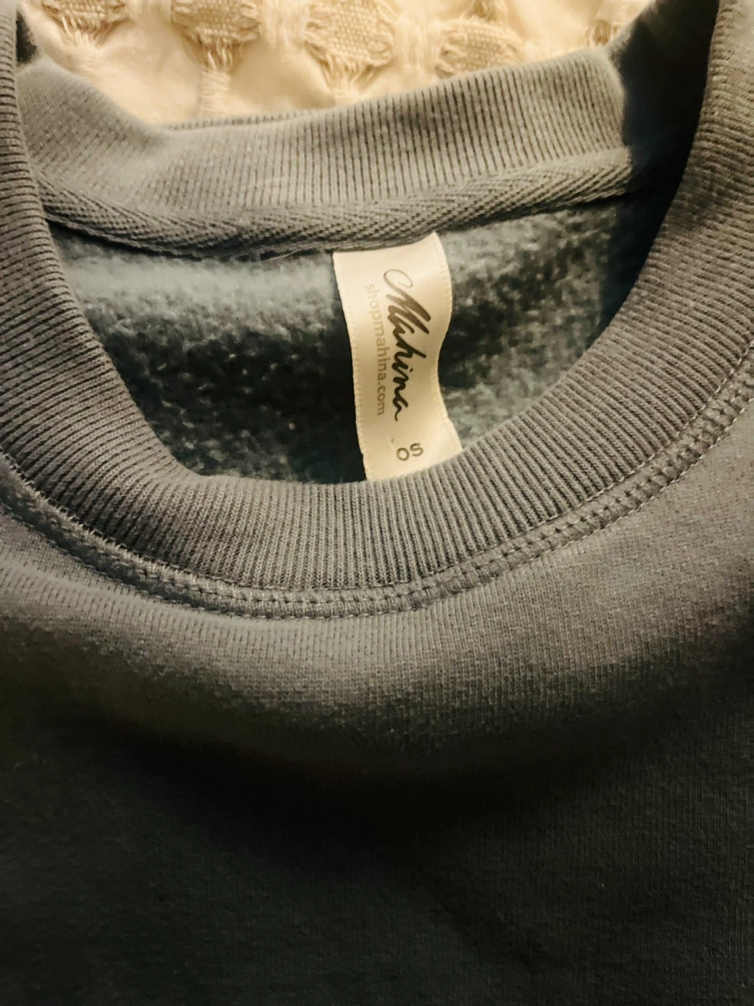 This Mahina sweatshirt features 'ALOHA' embossed on the front. It's a comfortable, one-size-fits-all (OS) piece. Made from soft fabric for casual wear.
