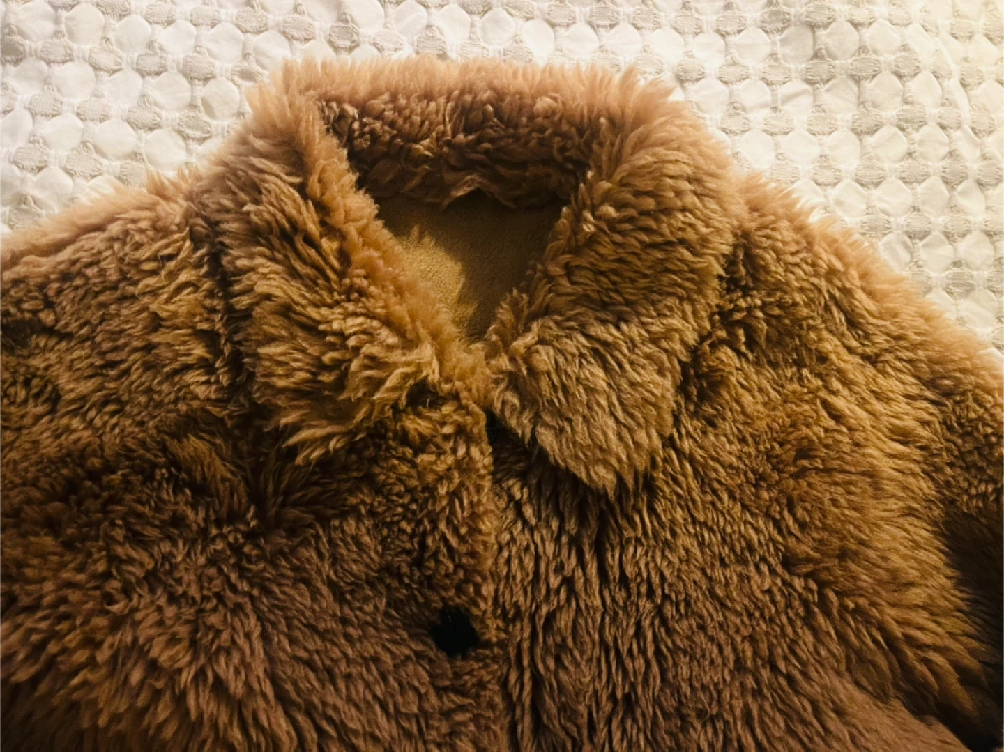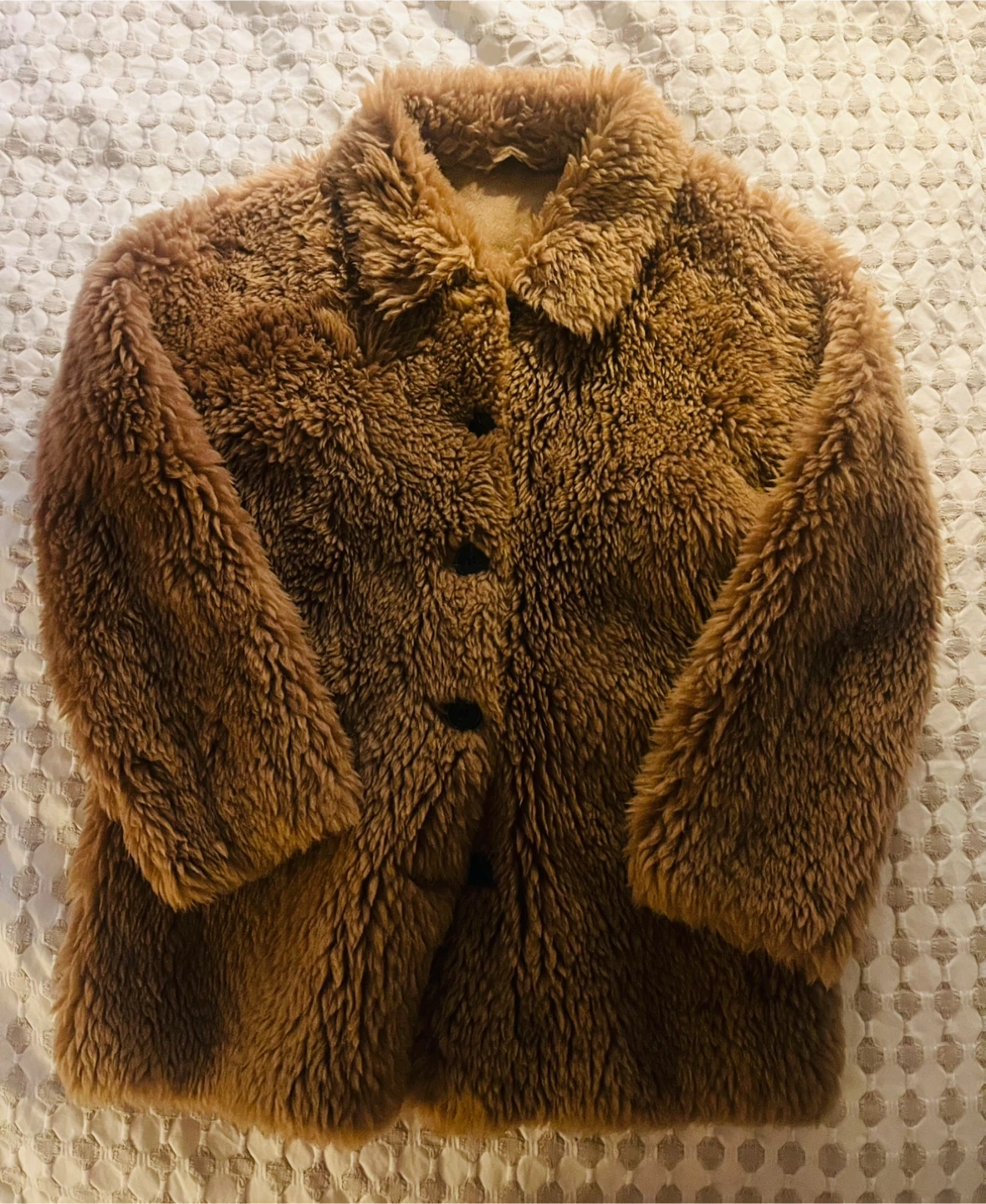 Couturist Cozy brown fuzzy jacket with a sherpa-style texture. It features a classic collar and button-up front. OS.