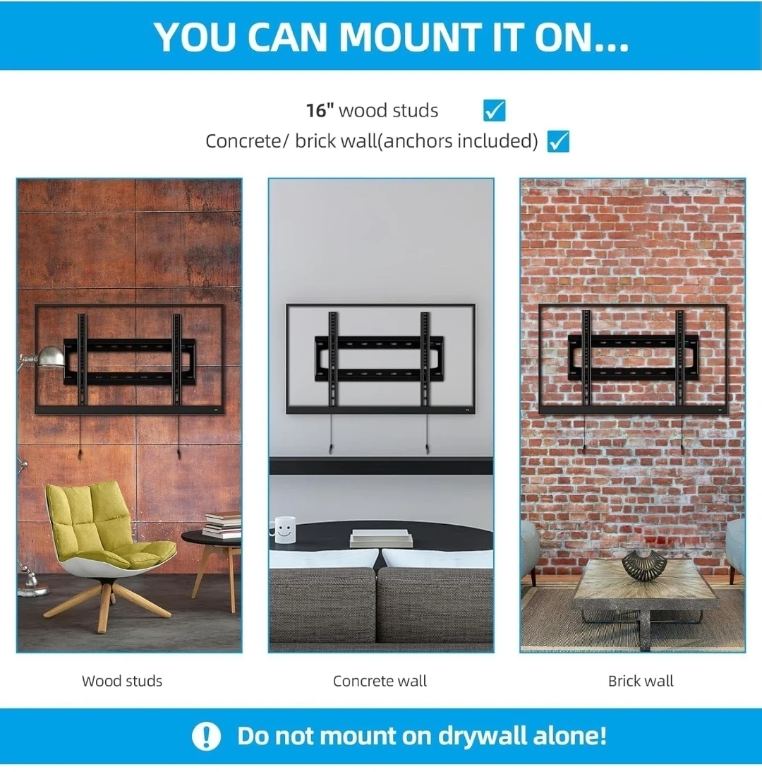 This fixed TV wall mount supports TVs from 26" to 65". It's designed for a low profile, keeping your TV close to the wall. Supports VESA up to 400x400mm and holds up to 100lbs. Mounts on 16" wood studs, concrete, or brick walls.