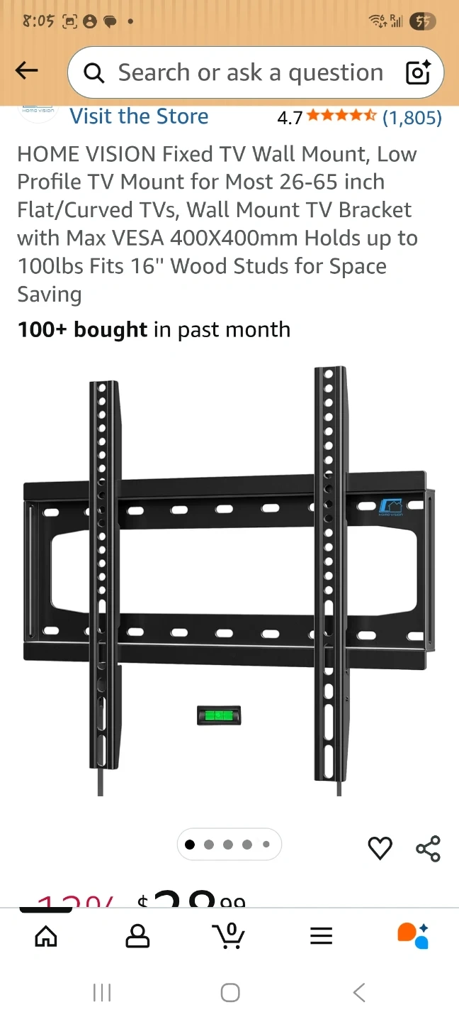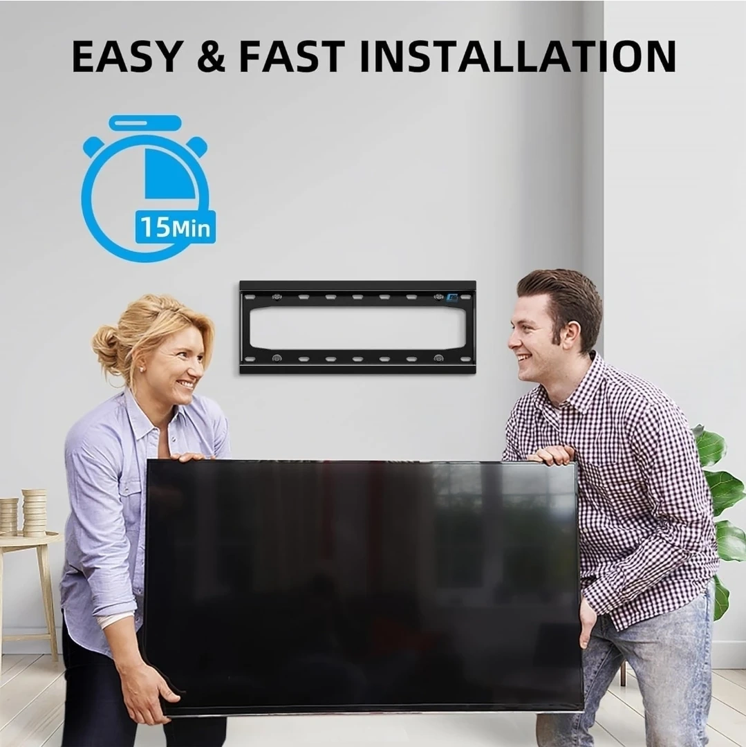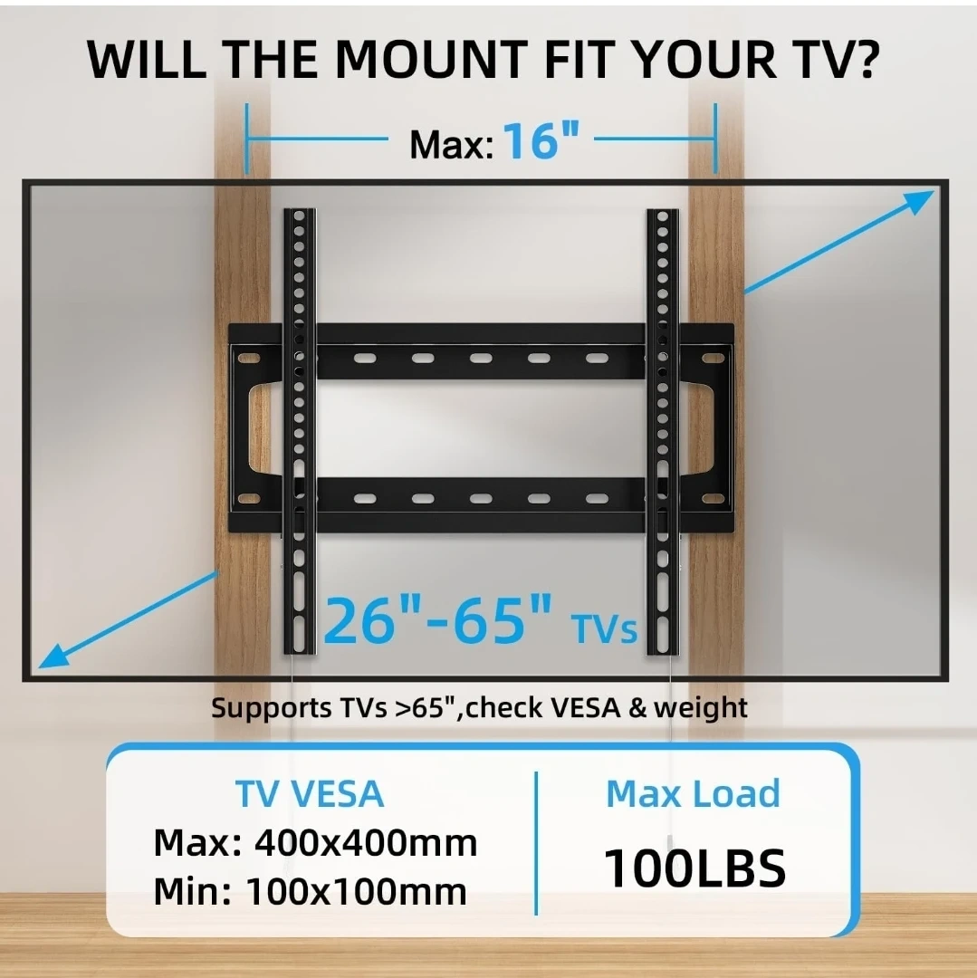 This fixed TV wall mount supports TVs from 26" to 65". It's designed for a low profile, keeping your TV close to the wall. Supports VESA up to 400x400mm and holds up to 100lbs. Mounts on 16" wood studs, concrete, or brick walls.