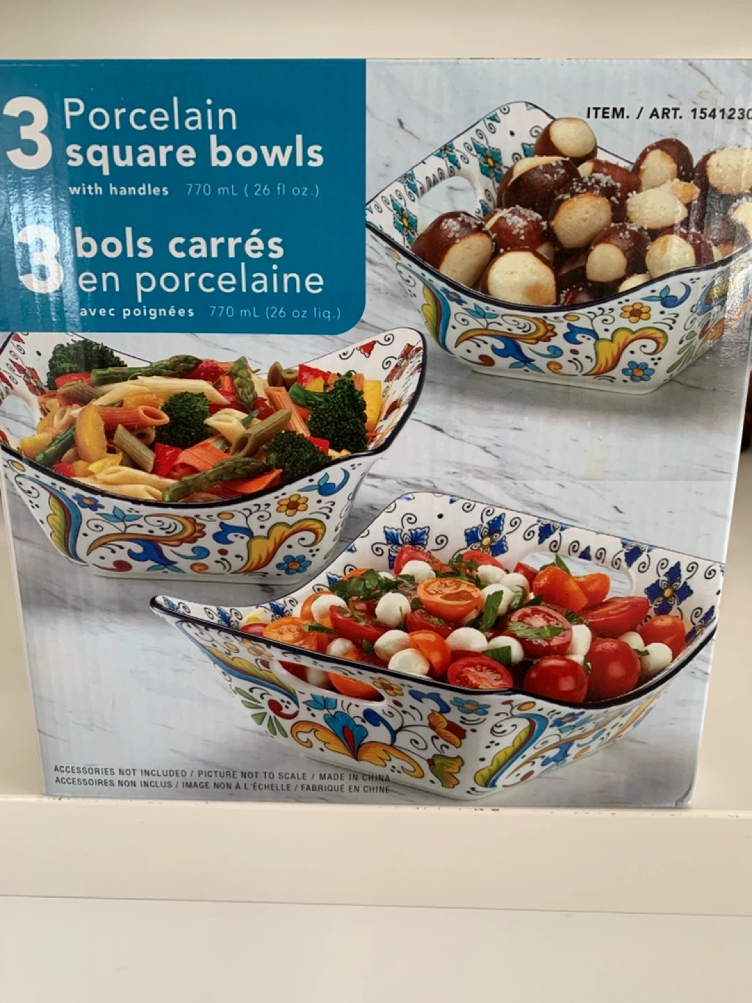 New in box -3 Porcelain Square Serving Bowls with Handles