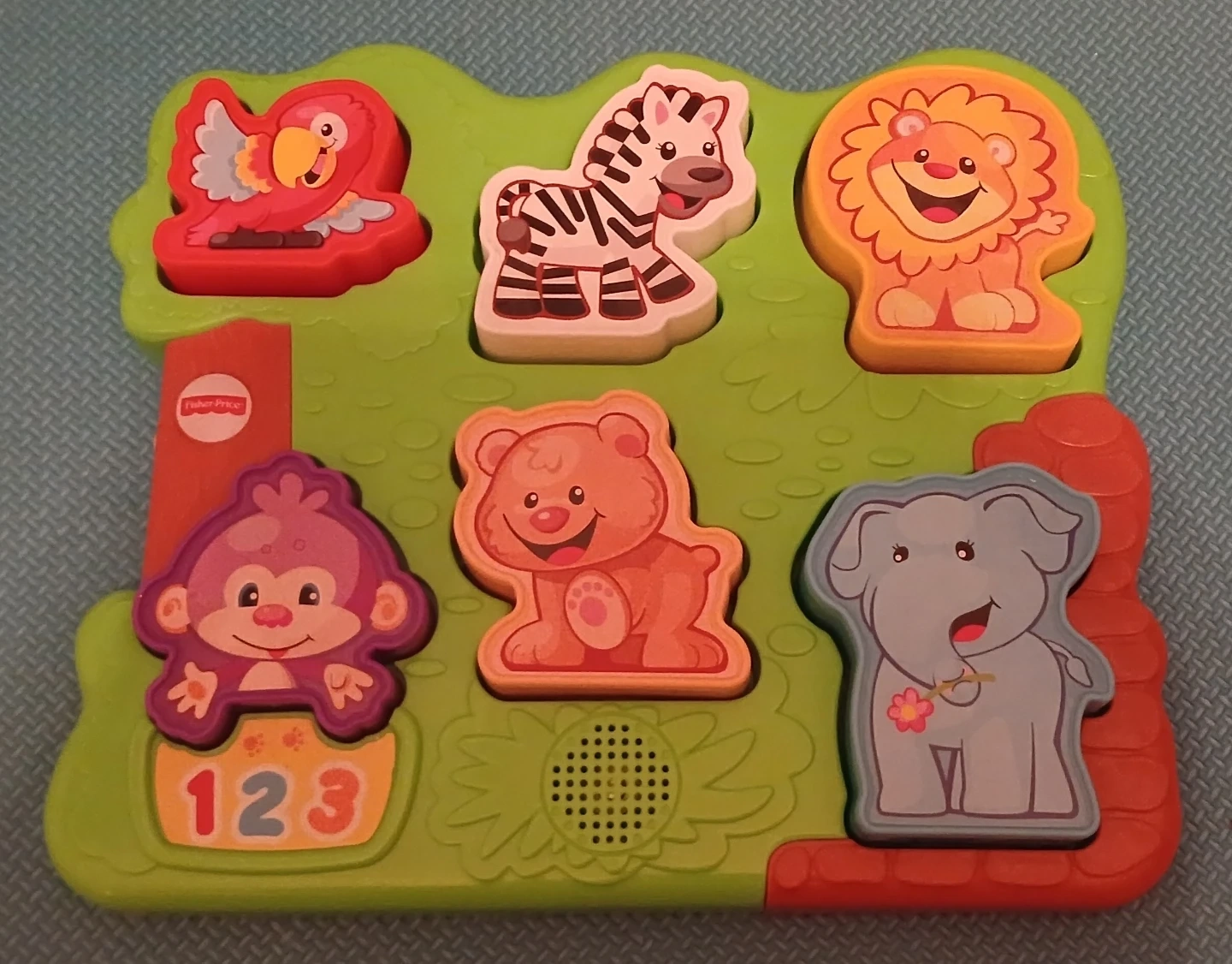 This Fisher-Price talking animal puzzle features a parrot, zebra, lion, monkey, bear, and elephant. It includes numbers 123 on the monkey piece. Great for little ones learning about animals!