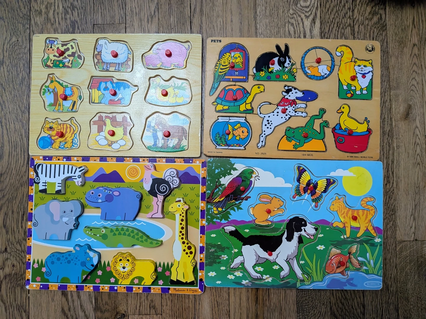 Set of five puzzles includes a wooden alphabet puzzle with colorful letter pieces. Also comes with four additional wooden inlay puzzles featuring animals and pets. Great for early learning and fine motor skills!