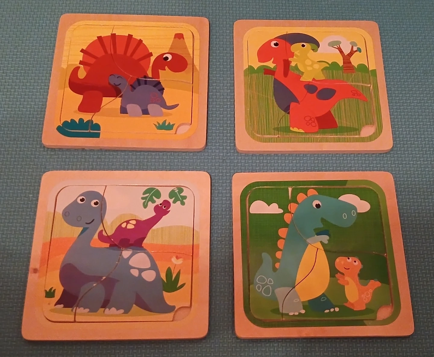 Set of 8 wooden chunky puzzles for kids. Includes four animal puzzles and four dinosaur puzzles. Made of wood. Great for little hands!