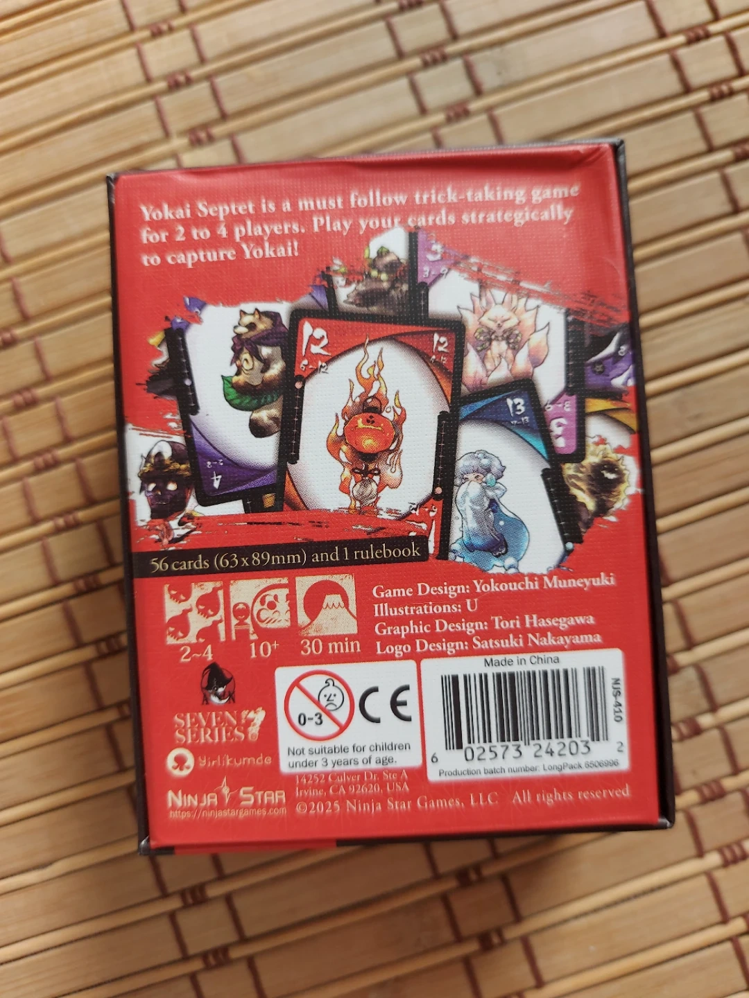Yokai Septet is a trick-taking game for 2-4 players. It comes with 56 cards (63x89mm) and 1 rulebook. The game is for ages 10+ and takes about 30 minutes to play.