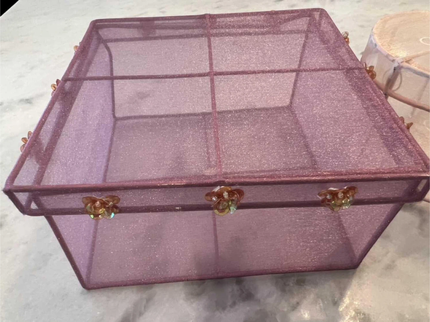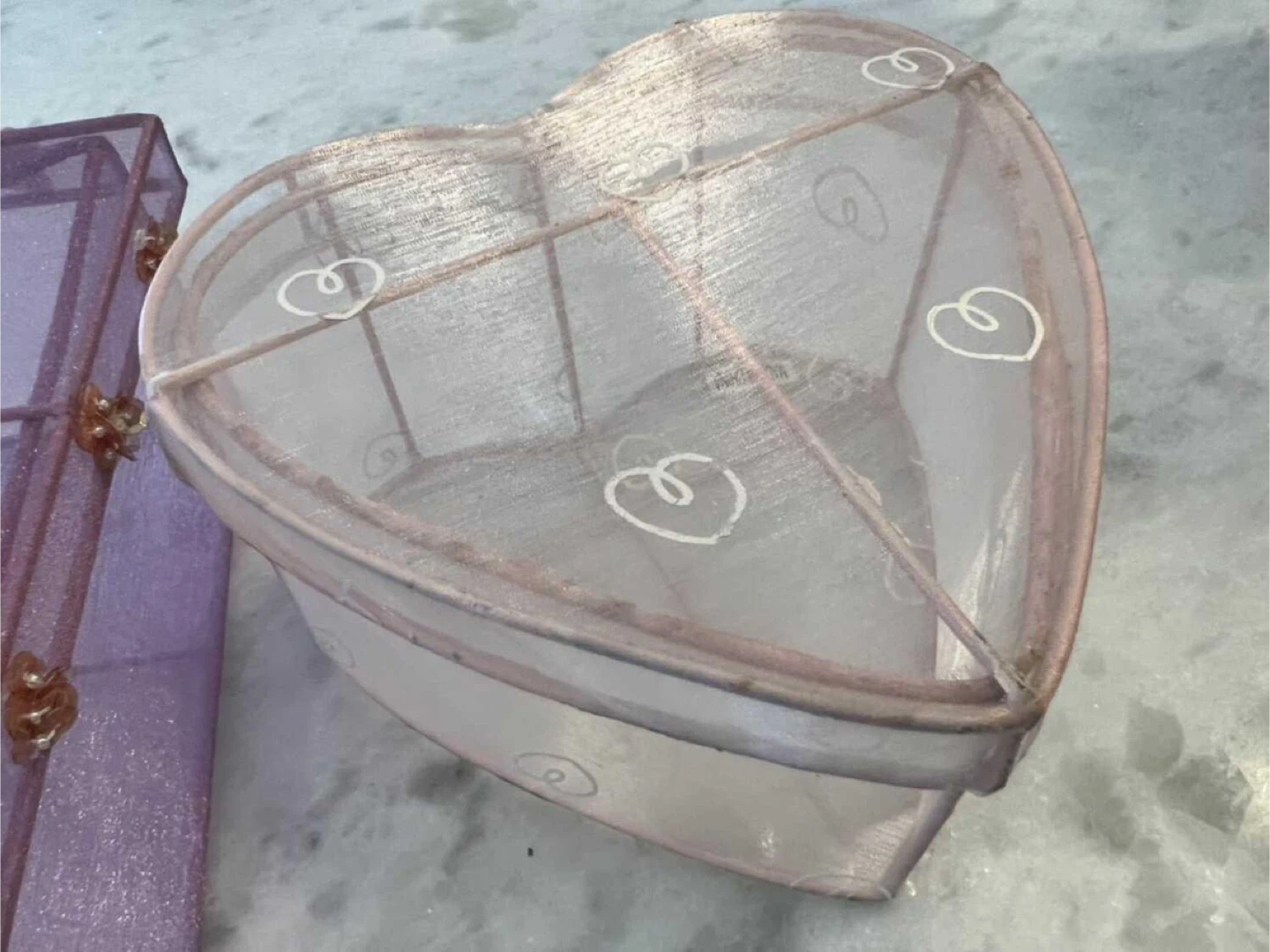 Two decorative storage boxes included: one square and one heart-shaped. Both are made of sheer glitter mesh fabric with wire frames and decorative floral accents.