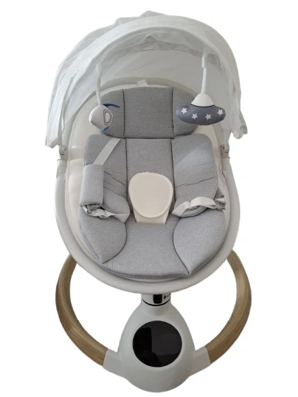 This baby swing rocker features a comfortable, supportive design with head, shoulder, and hip support. It includes music functions and comes with a remote control for convenience. The design protects the baby's spine, offering a safe and soothing experience.