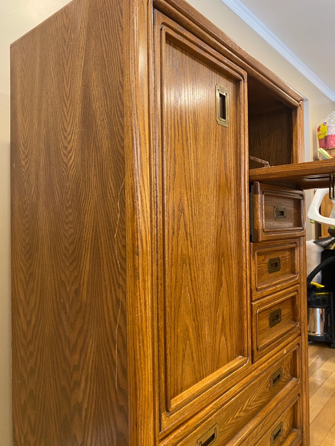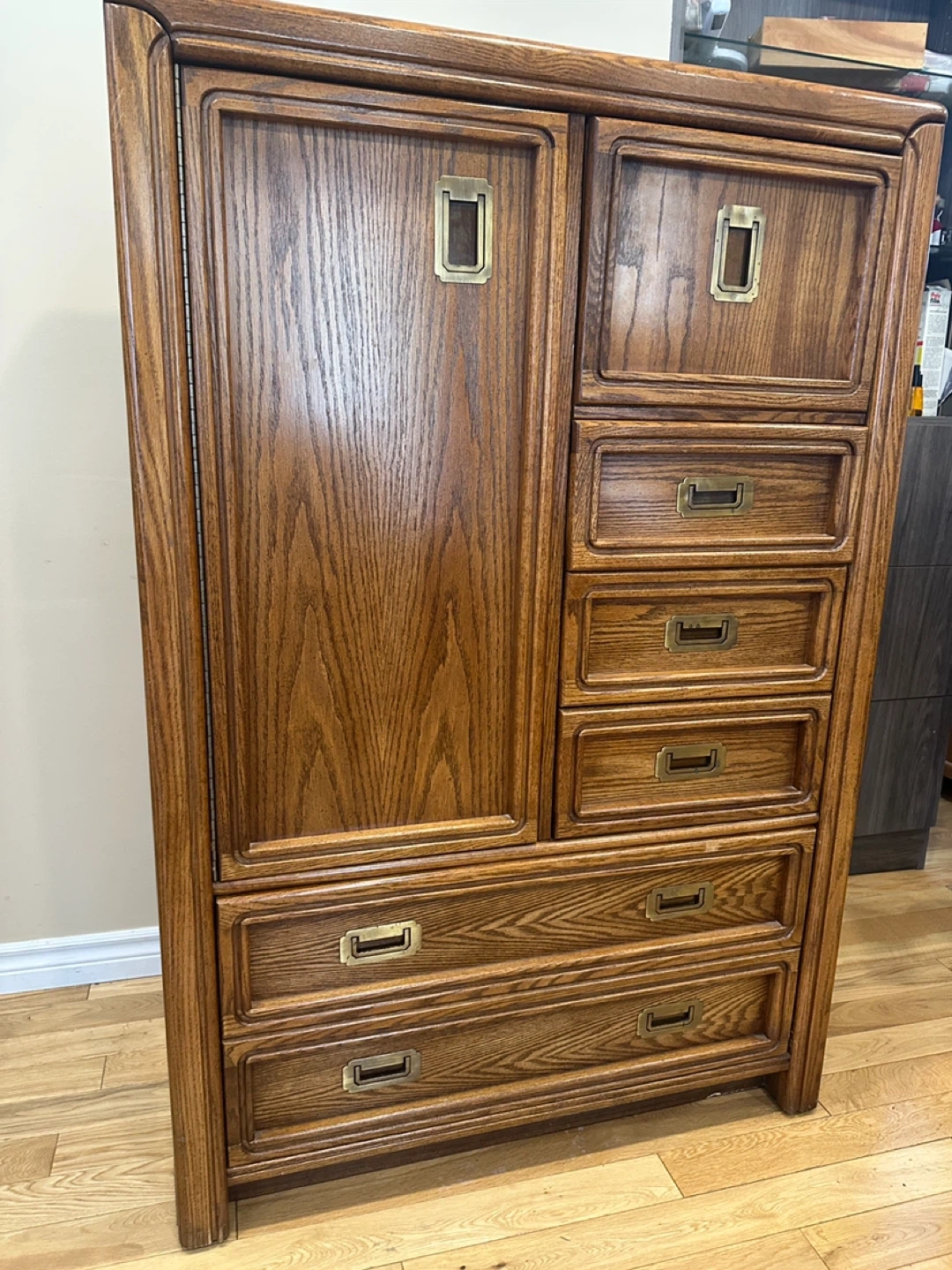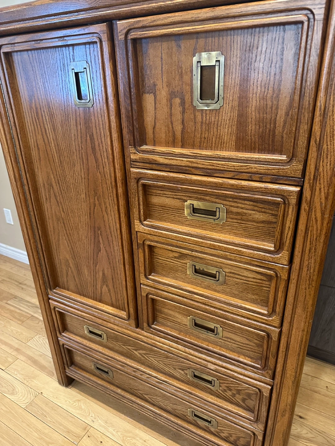 Vintage tall wardrobe dresser with cabinet storage, drawers, and a drop-front compartment. Solid, functional piece with classic oak finish.