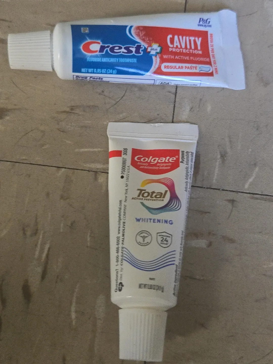 Two tubes of toothpaste included. Crest Cavity Protection is a regular paste fluoride anticavity toothpaste. Colgate Total Whitening is for active prevention. Net WT 0.85 OZ (24g) for Crest and 0.22 OZ (6.4g) for Colgate.