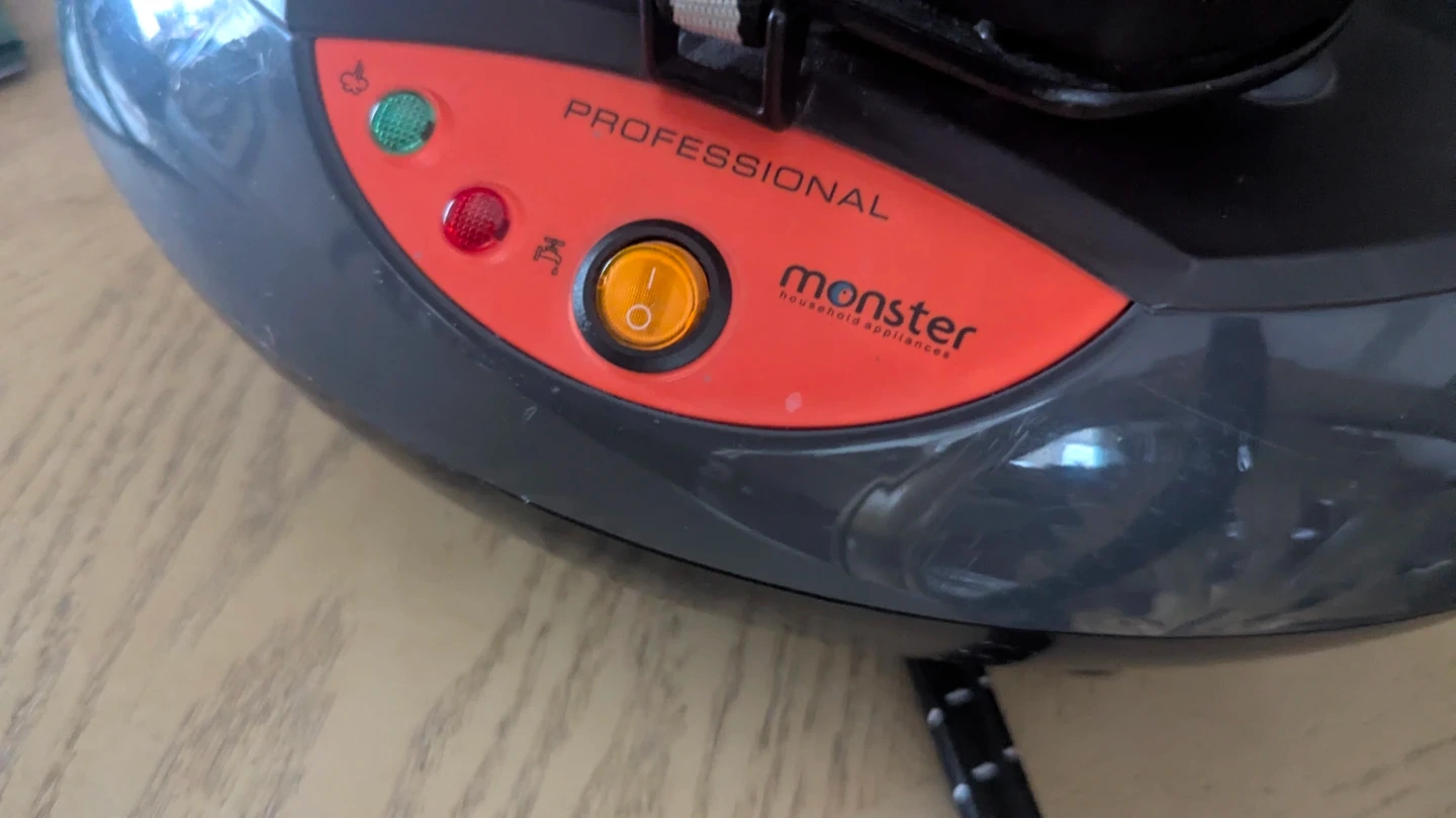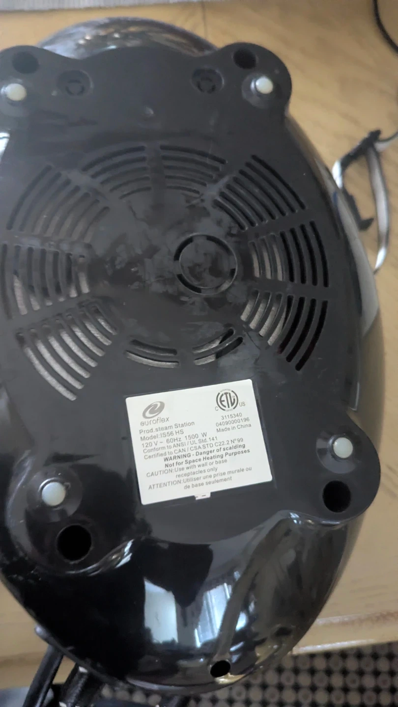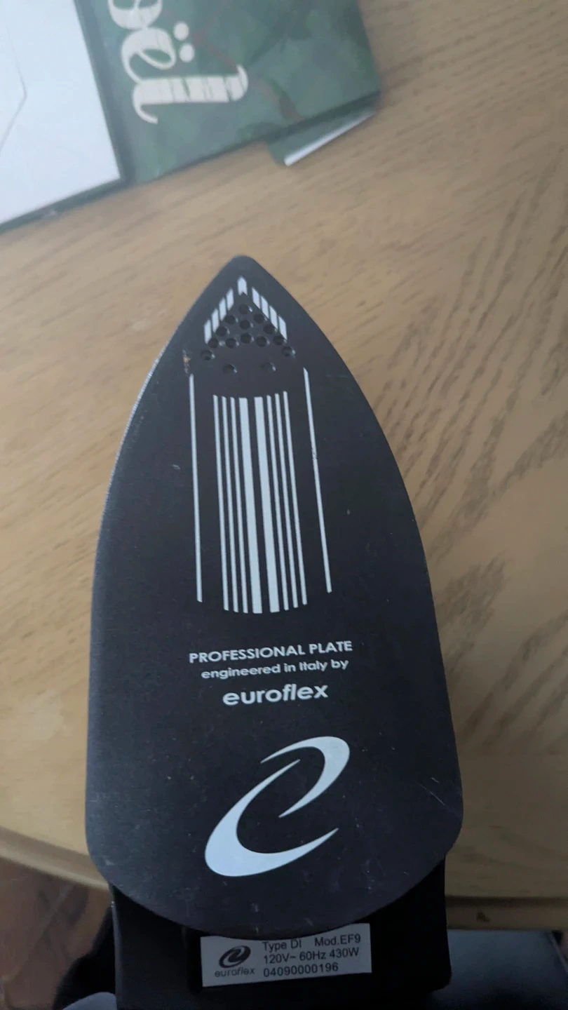 This is a Euroflex Monster Professional Steam Station iron. It has a 1500 W power rating and operates on 120 V. It's designed for household appliances.