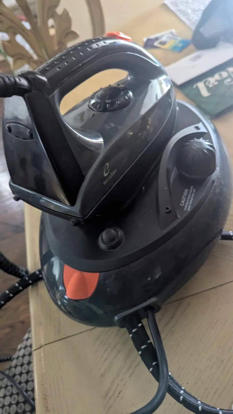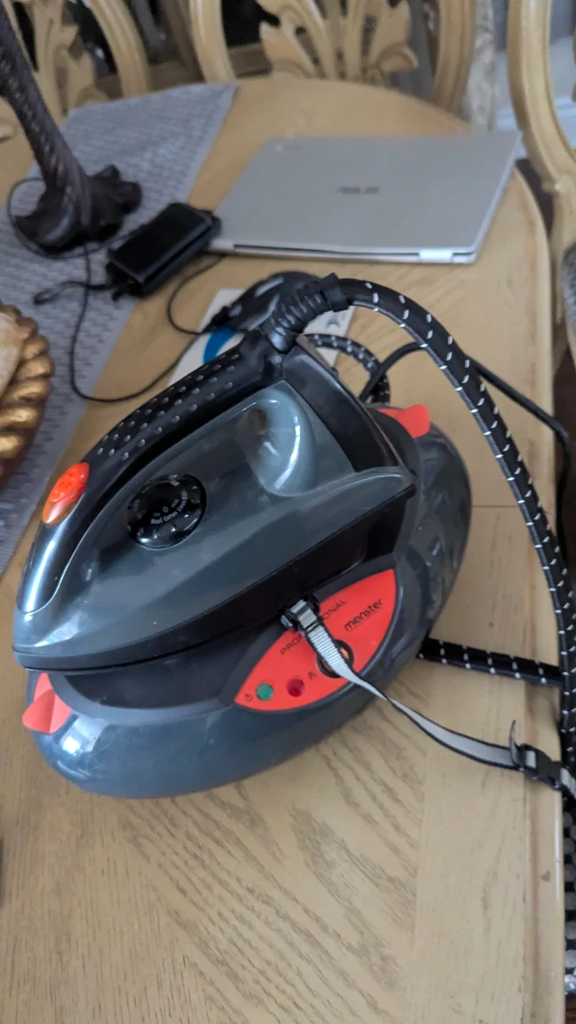 This is a Euroflex Monster Professional Steam Station iron. It has a 1500 W power rating and operates on 120 V. It's designed for household appliances.