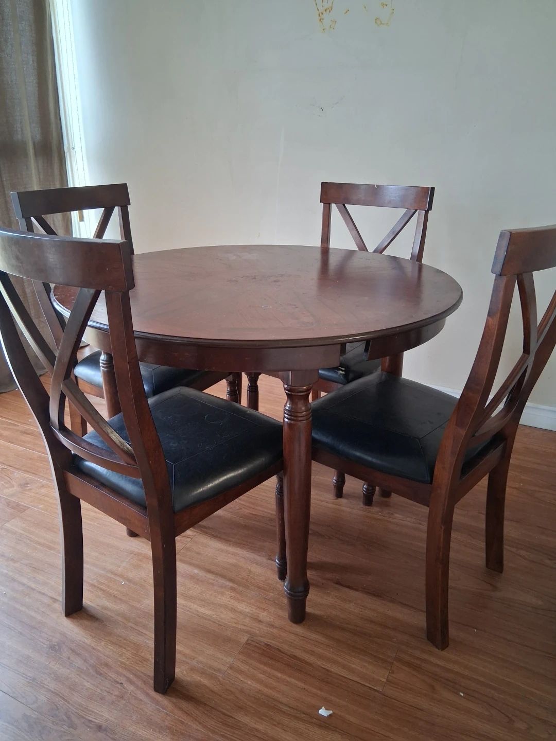 This is a round, dark wood dining table with four matching chairs. The chairs have black faux leather seats and wooden backs. It's a classic set perfect for smaller dining spaces.