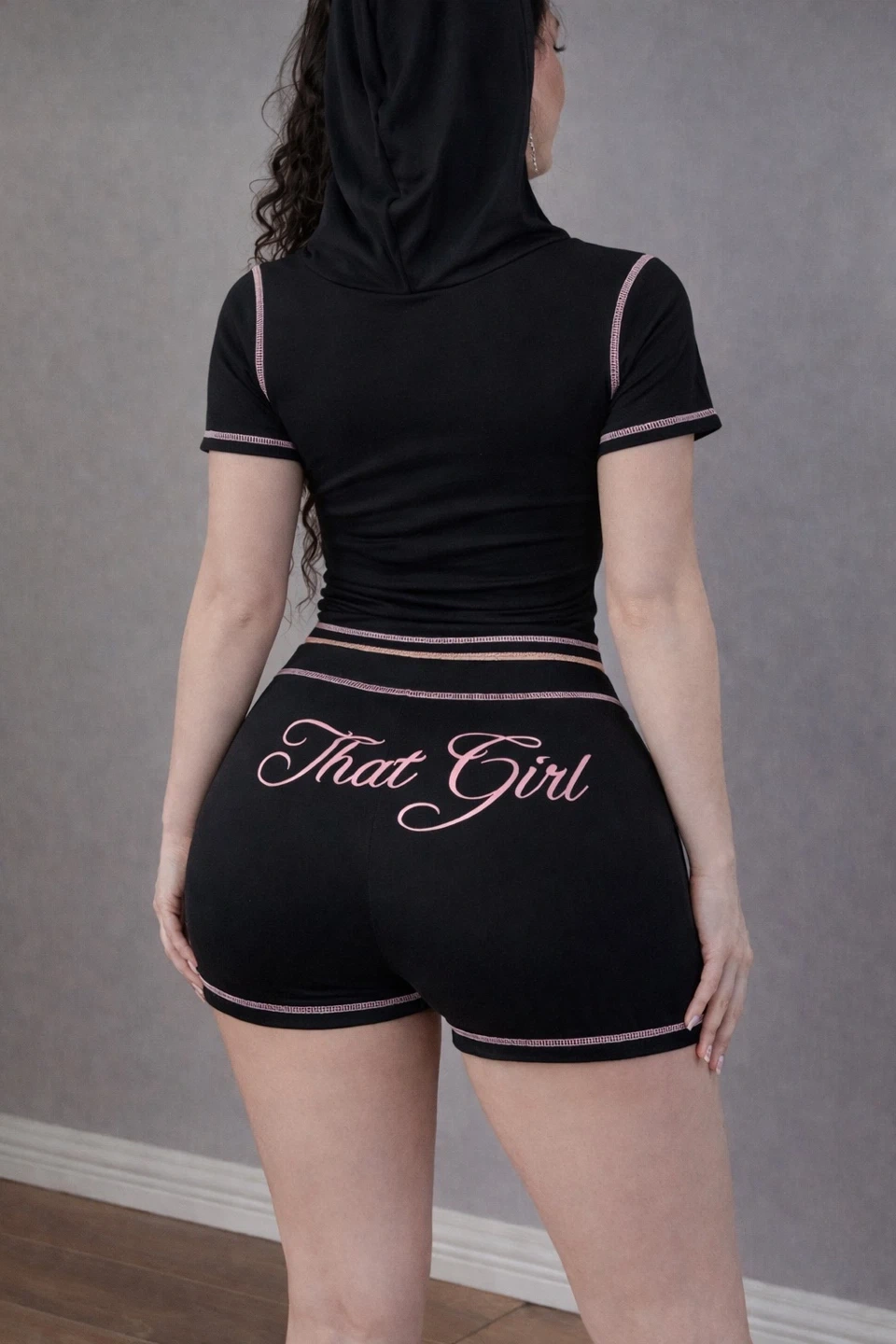This is a two-piece black tracksuit set with "Girl" on the front of the hoodie top and "That Girl" on the back of the shorts. It features pink contrast stitching. The set includes a zip-up short-sleeved hooded top and matching shorts. Perfect for casual wear! Size Medium but can fit small as well.