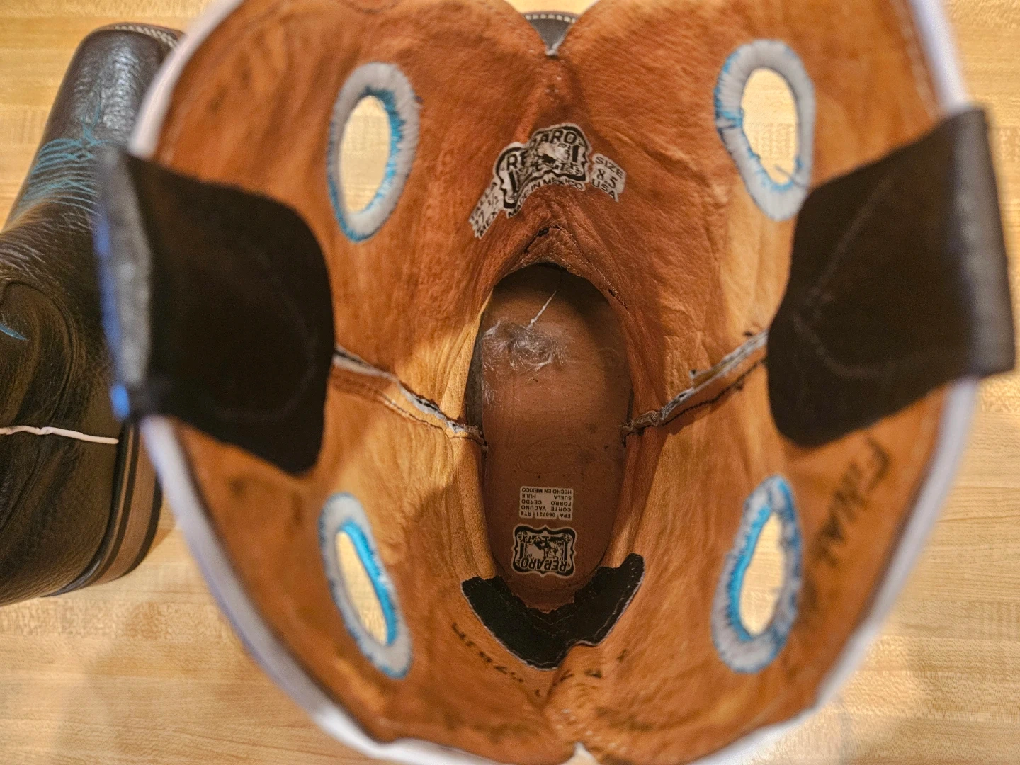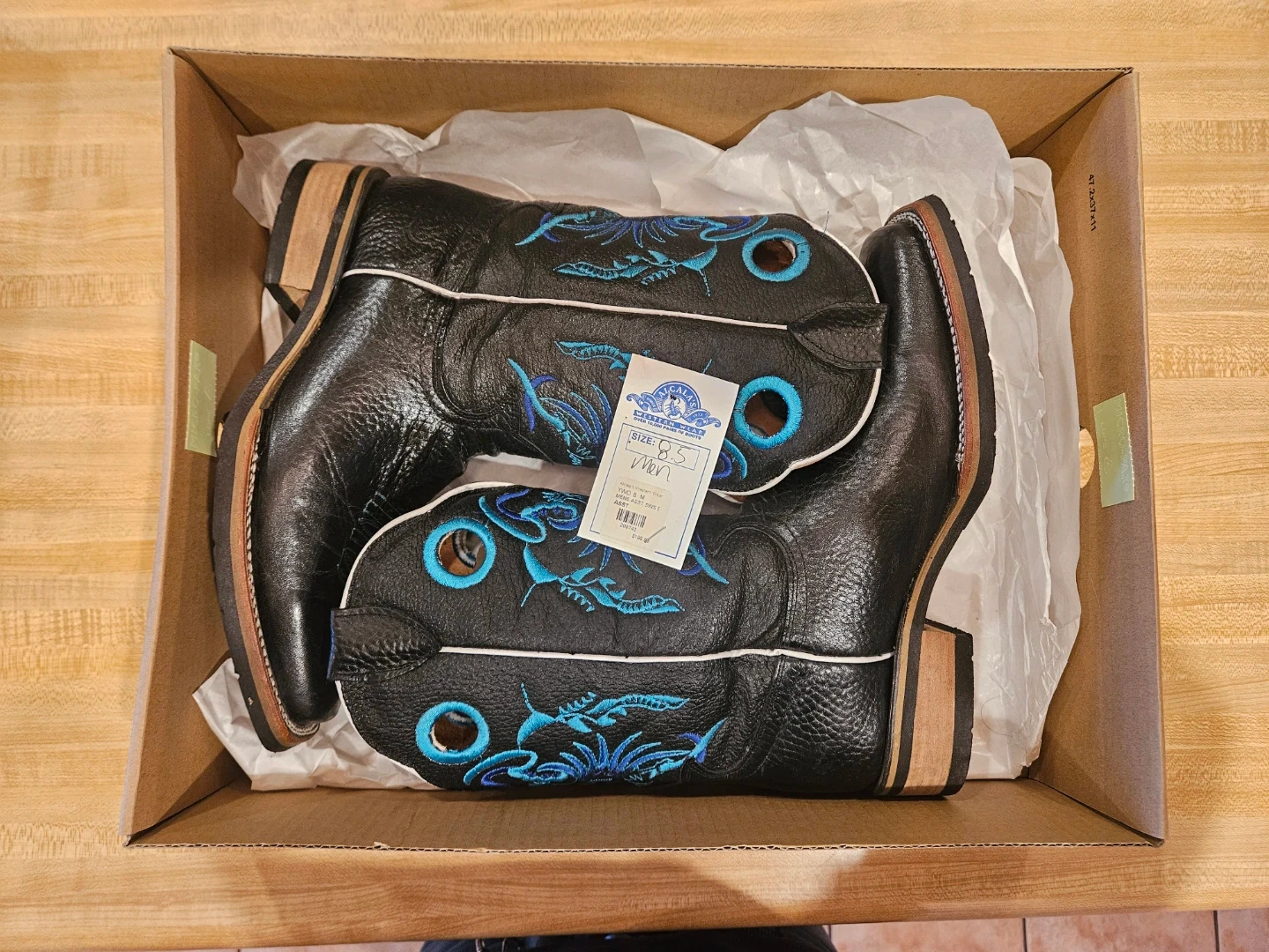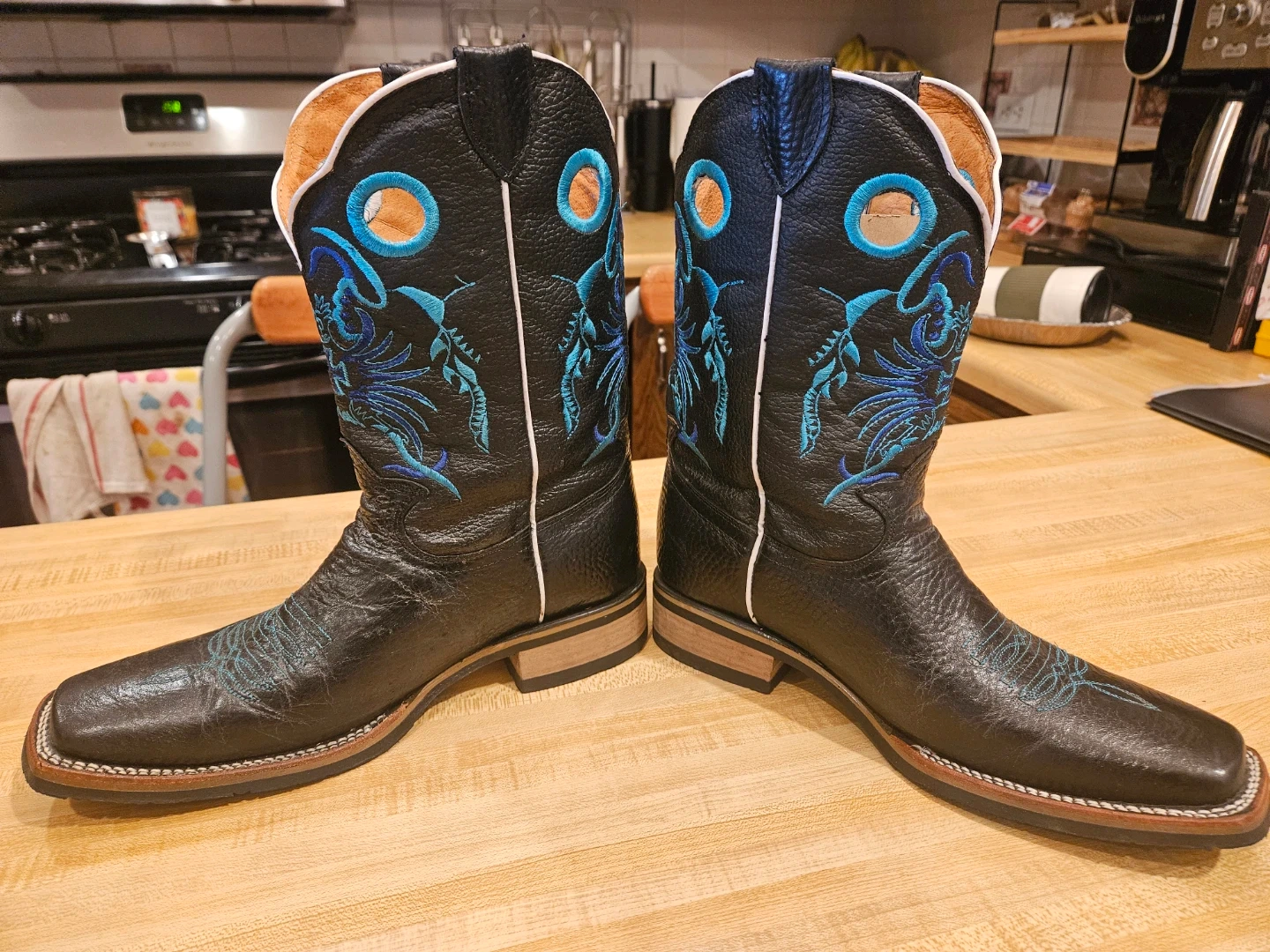 Black leather western boots with blue embroidery. Size 8.5 USA. Made in Mexico. Square toe. Wore once.