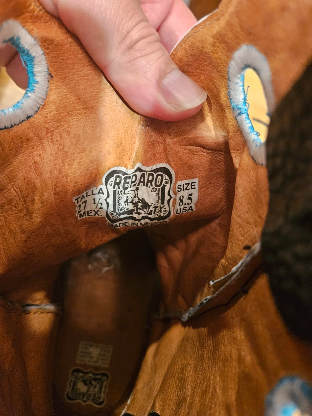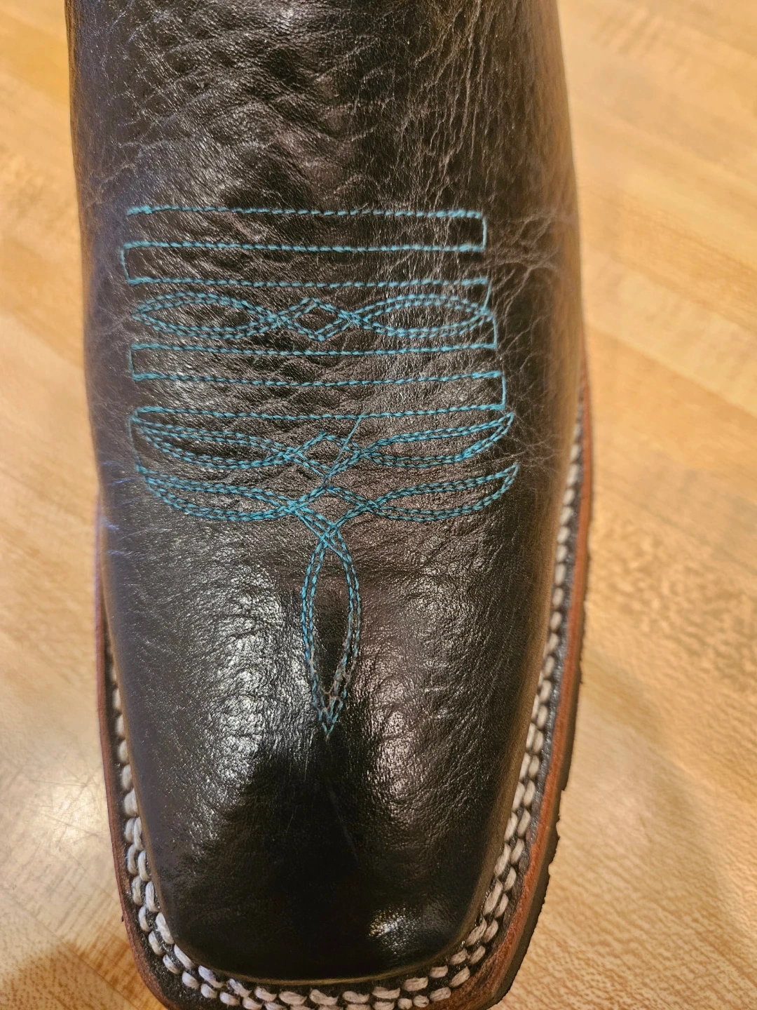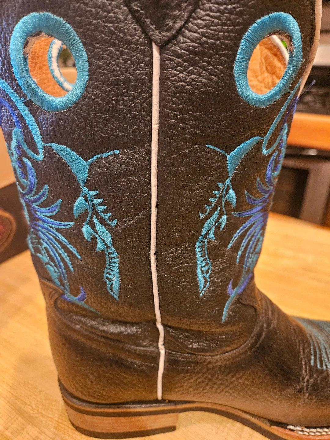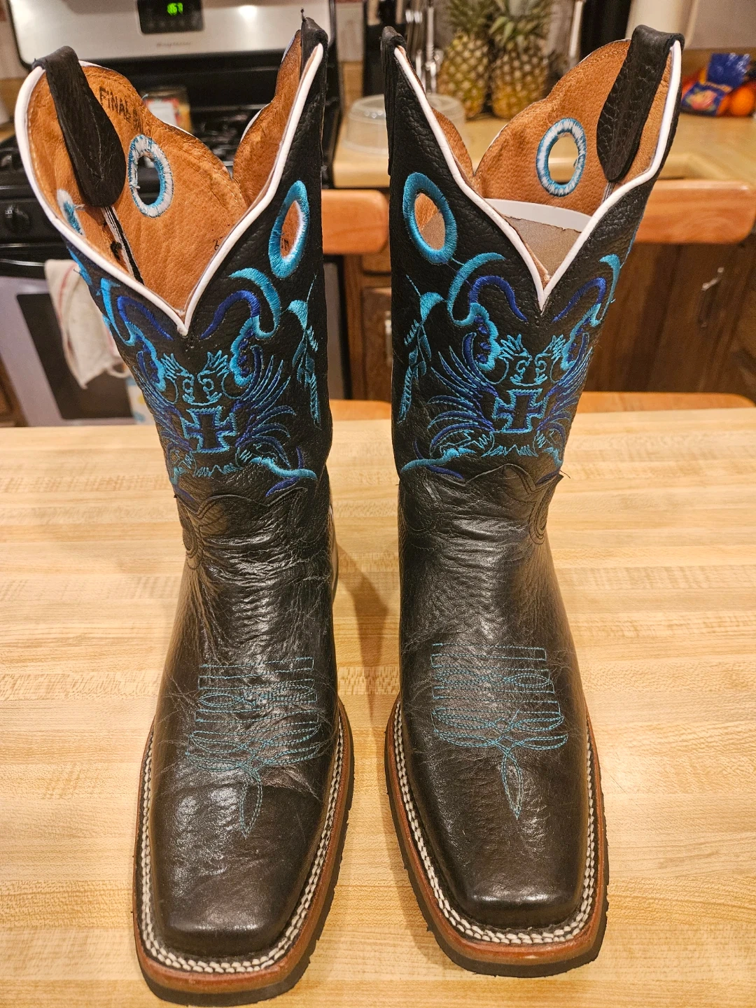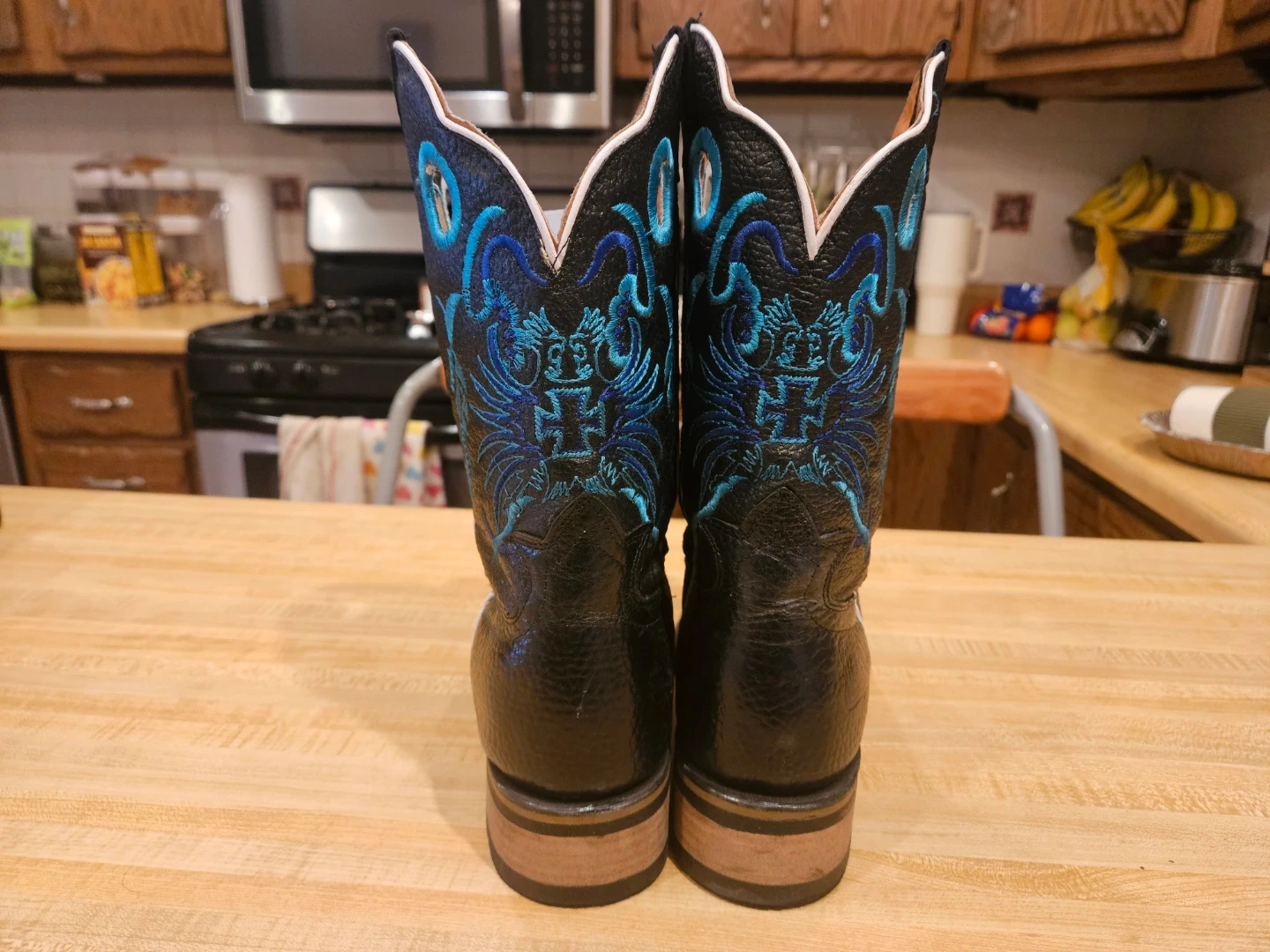 Black leather western boots with blue embroidery. Size 8.5 USA. Made in Mexico. Square toe. Wore once.