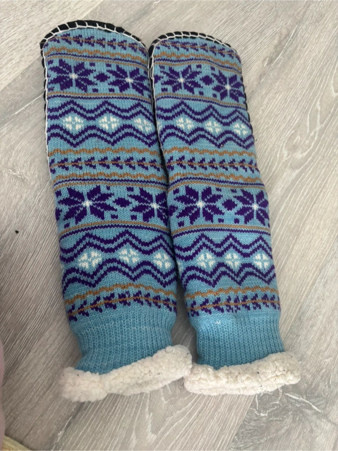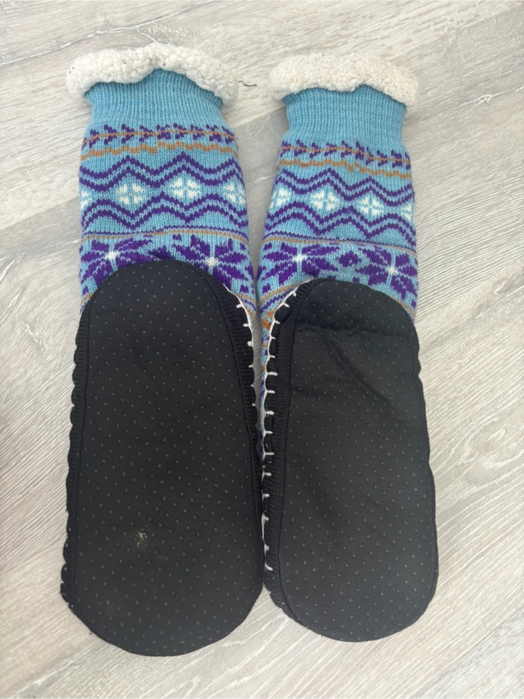 Warm and fuzzy slipper socks with a classic Nordic pattern. They're lined with soft sherpa fleece for extra comfort. The non-slip grippers on the soles help prevent slips. Perfect for keeping your feet toasty on chilly days!