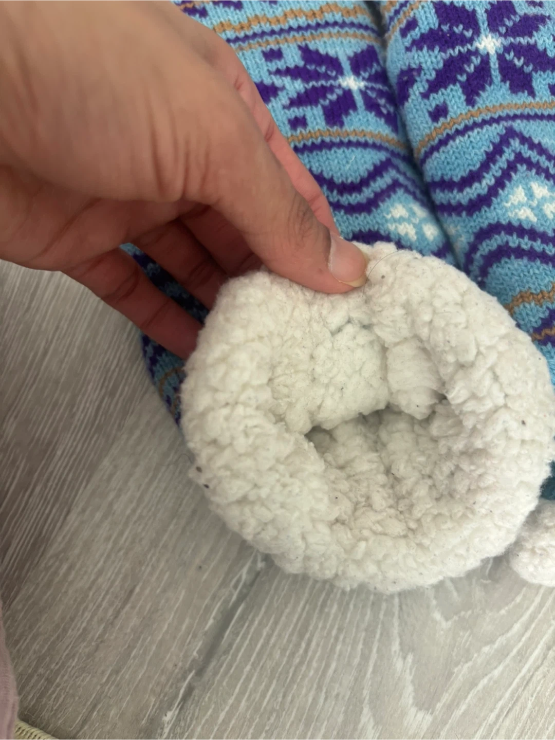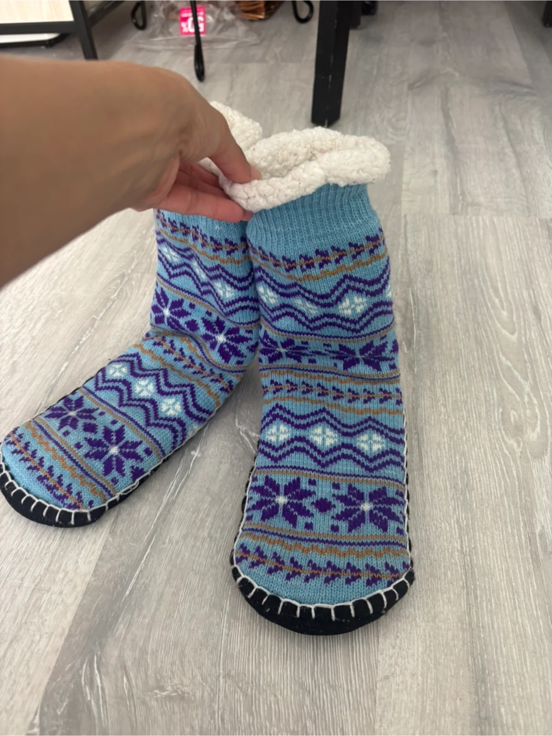 Warm and fuzzy slipper socks with a classic Nordic pattern. They're lined with soft sherpa fleece for extra comfort. The non-slip grippers on the soles help prevent slips. Perfect for keeping your feet toasty on chilly days!