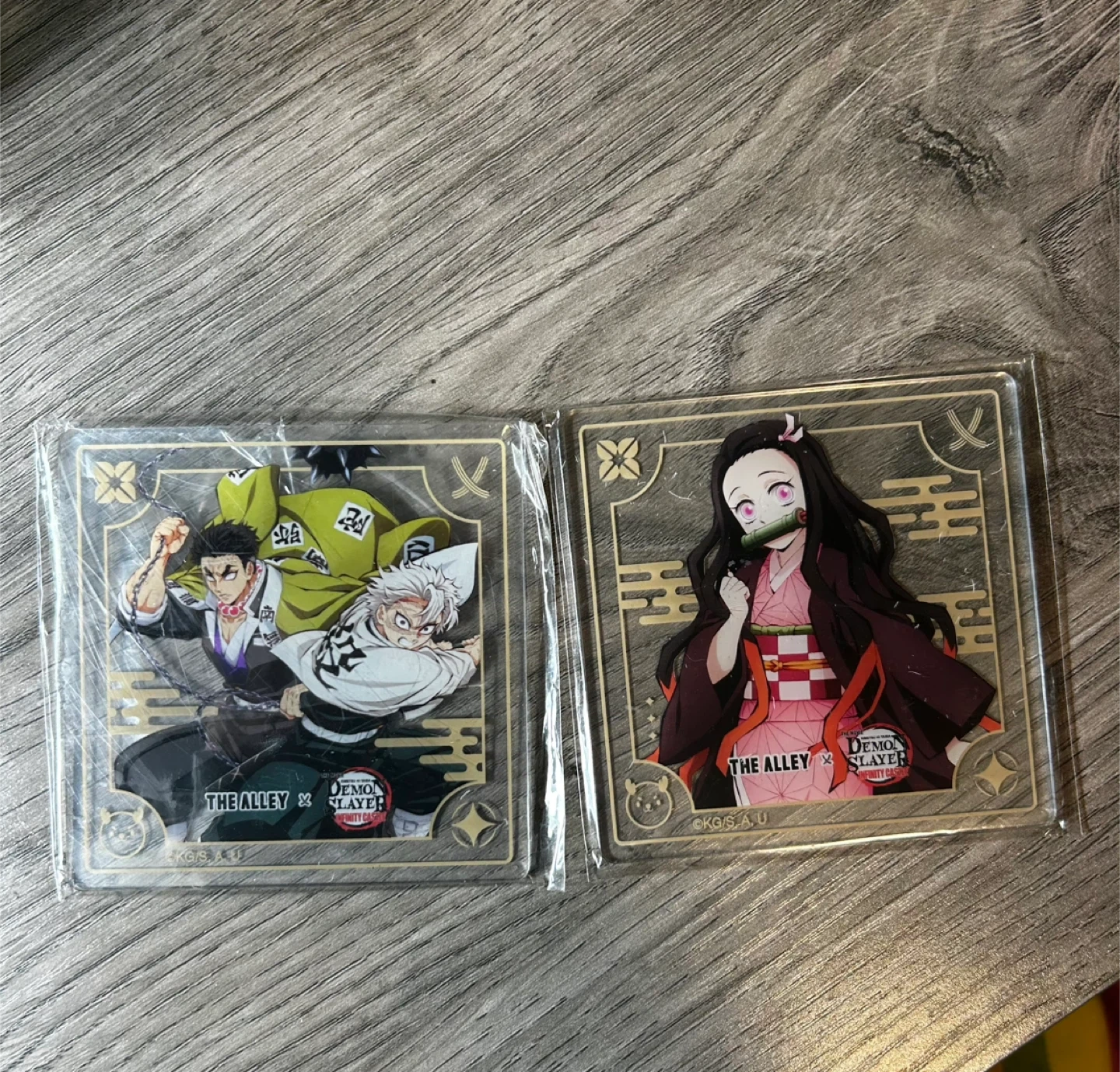Two acrylic coasters featuring characters from Demon Slayer. One coaster shows Nezuko, and the other displays Gyomei and Sanemi Shinazugawa. Part of The Alley Collab:)