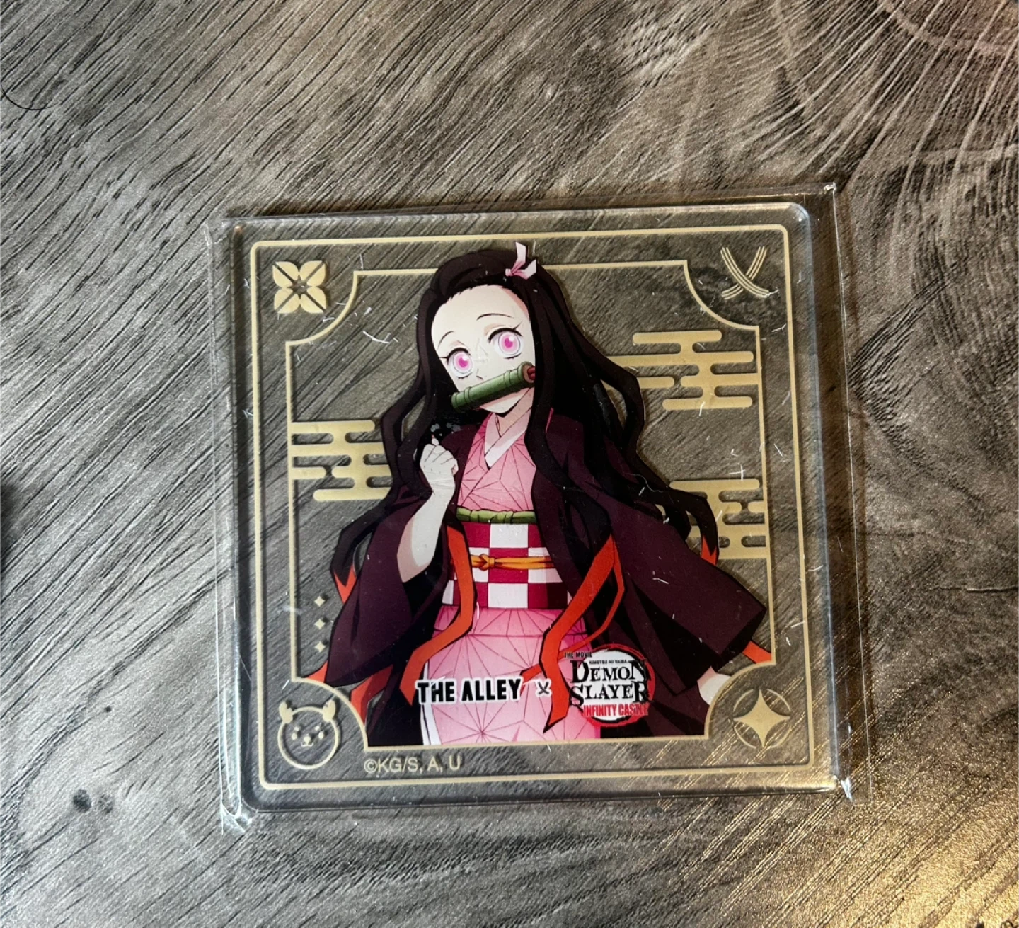 Two acrylic coasters featuring characters from Demon Slayer. One coaster shows Nezuko, and the other displays Gyomei and Sanemi Shinazugawa. Part of The Alley Collab:)