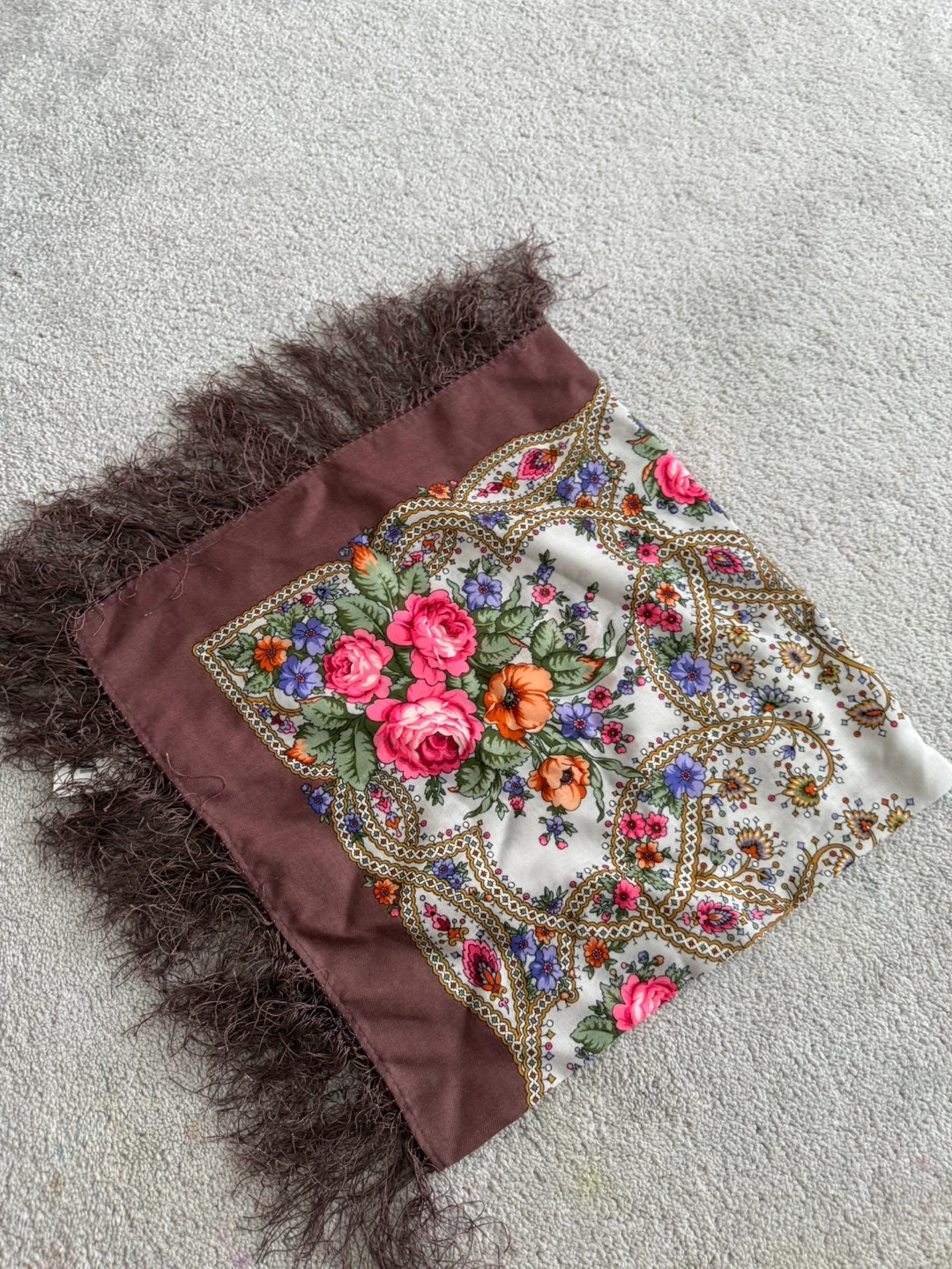 A beautiful wool scarf from Pavlovo Posad featuring a vibrant floral design and fringed edges. It's made of 100% merino wool. Measures 89x89cm.