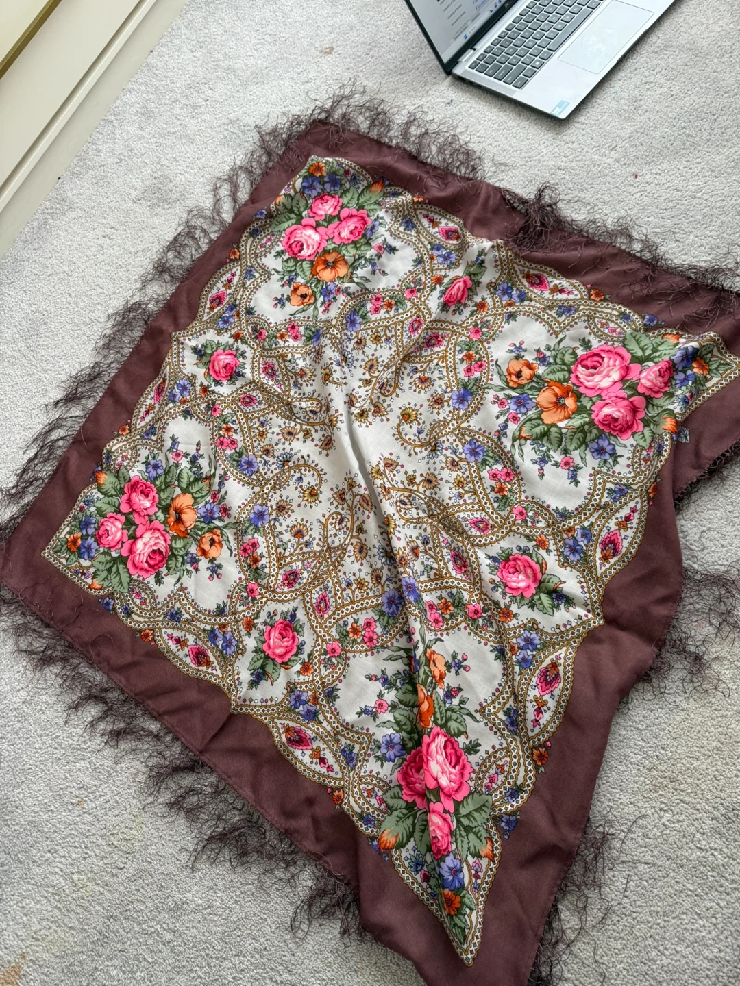 A beautiful wool scarf from Pavlovo Posad featuring a vibrant floral design and fringed edges. It's made of 100% merino wool. Measures 89x89cm.