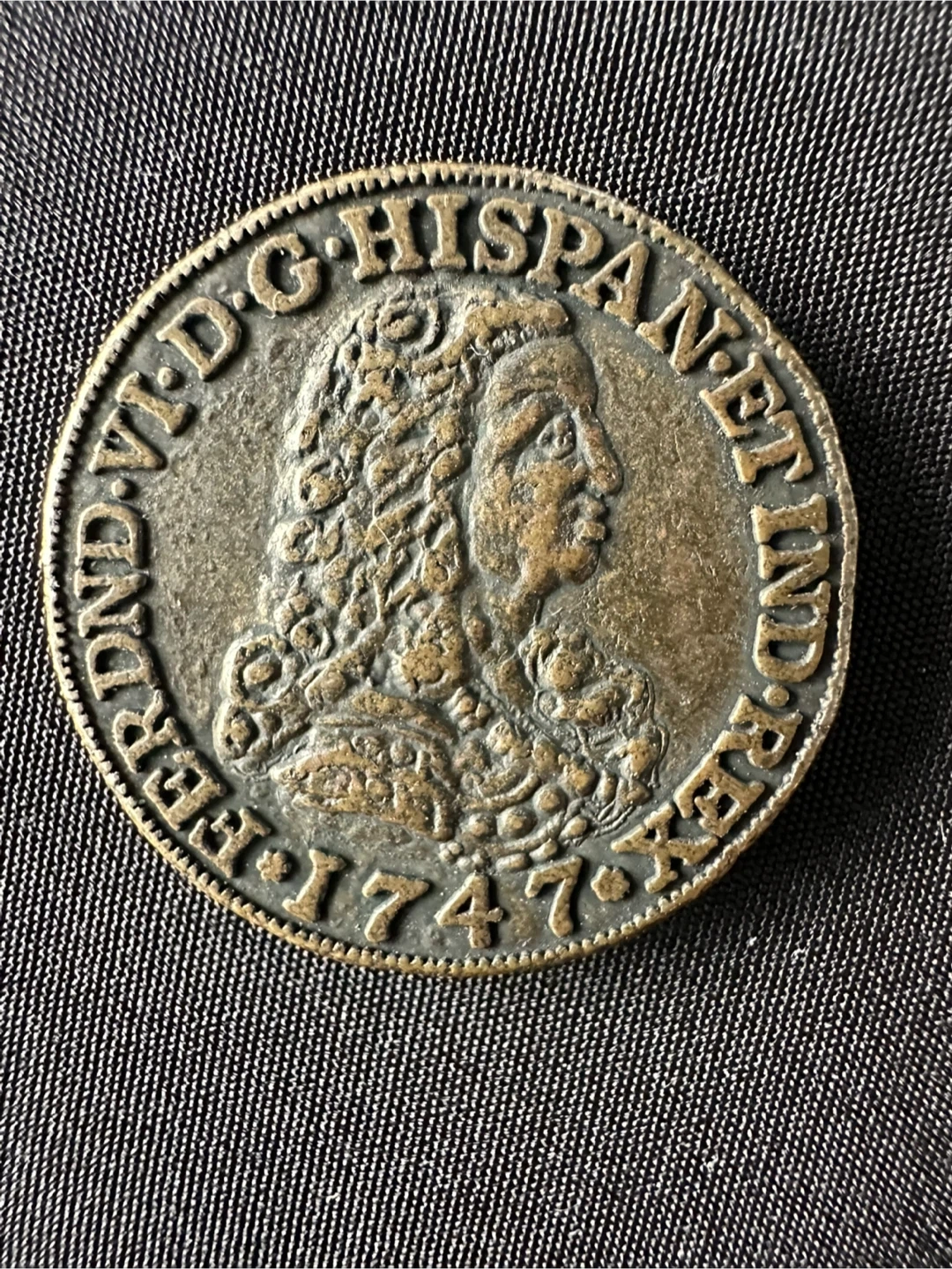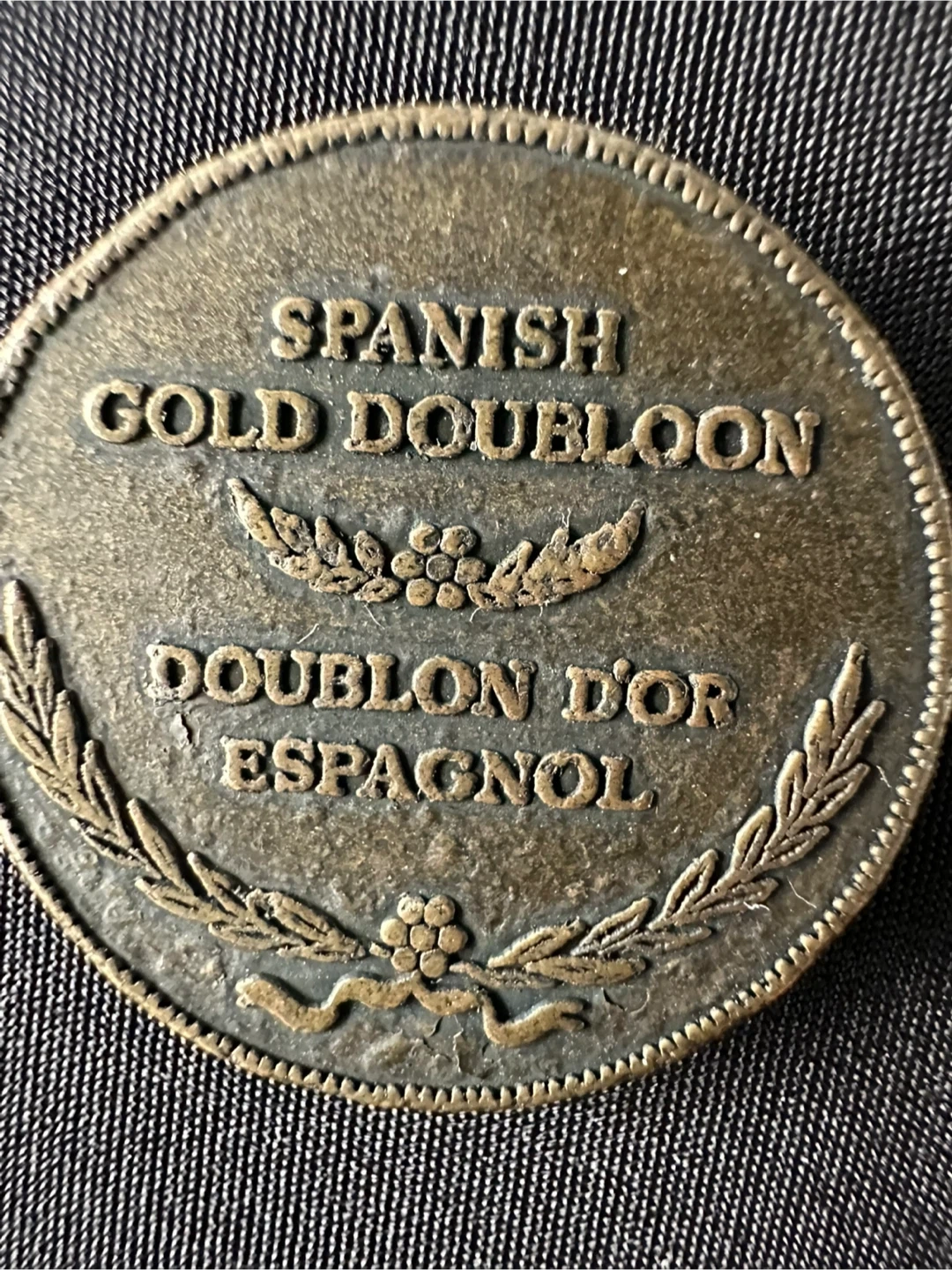 This is a replica Spanish Gold Doubloon coin. The inscription reads 'Doublon d'Or Espagnol' and features a portrait with the date 1747. It's made of metal, giving it a realistic feel. This coin makes for an interesting display piece or prop.