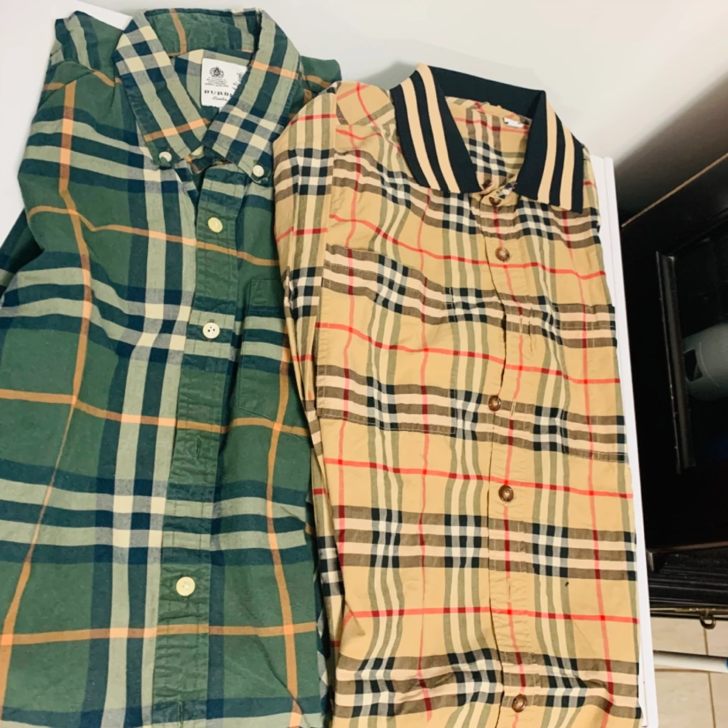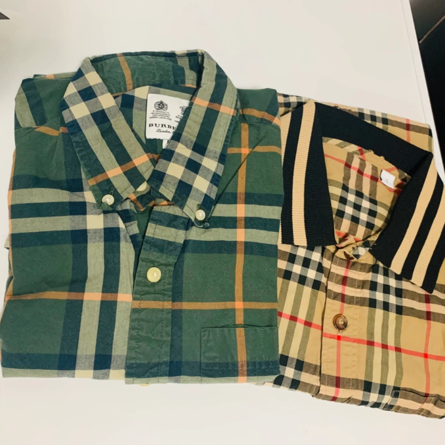 Two classic Burberry checked shirts. One features a green, blue, and orange plaid, while the other is in the iconic beige, black, and red nova check. Both are button-down style.