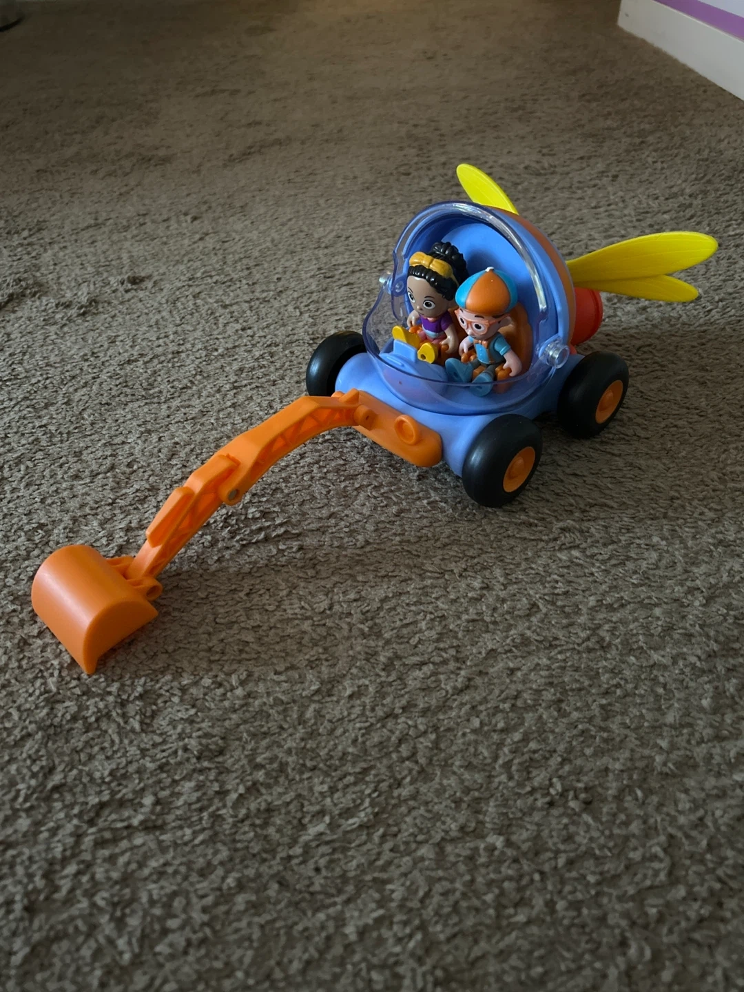 This is a Blippi excavator toy. It comes with two Blippi figures. The excavator scoop is orange and the vehicle is blue with yellow wings.
