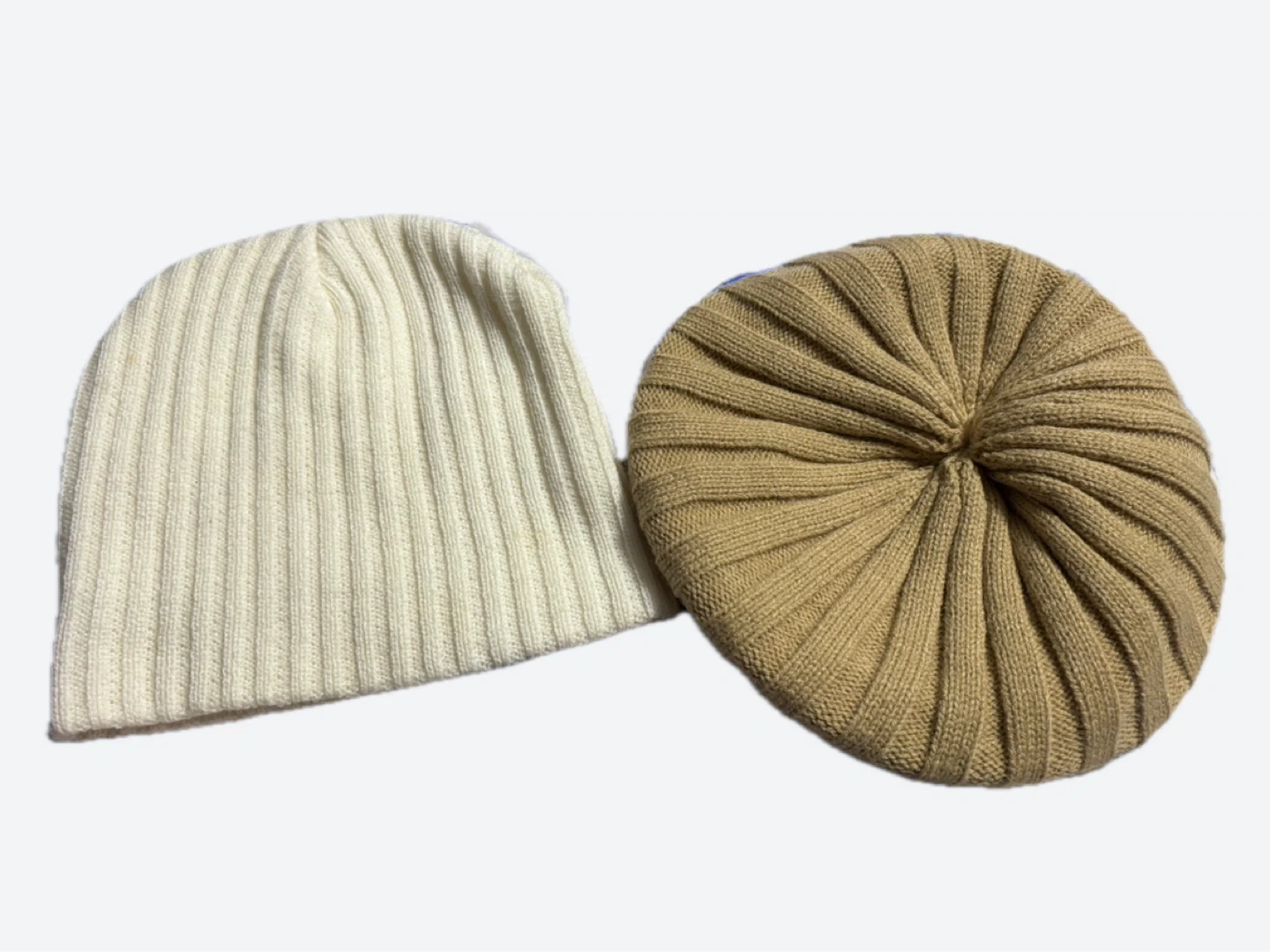 This set includes a stylish beige knit beret and a cream knit beanie. Both hats are made from a soft, ribbed knit material. They're perfect for keeping warm on cooler days!