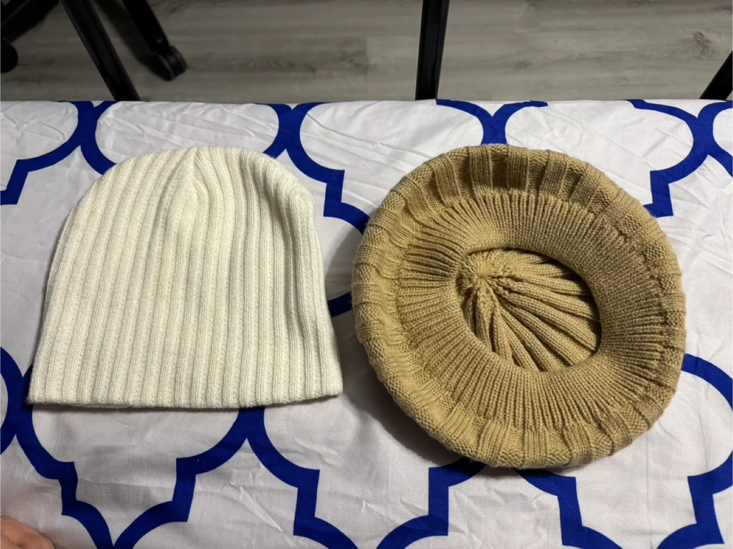 This set includes a stylish beige knit beret and a cream knit beanie. Both hats are made from a soft, ribbed knit material. They're perfect for keeping warm on cooler days!