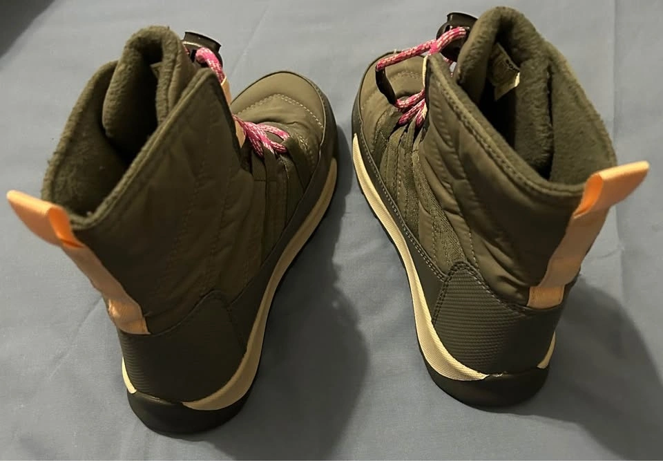Get out in the snow in these adorable little girl Sorel Whitney II snow boots. Gray with pink details and laces. Easy on and off with bungee cord laces. Removable foot bed. Micro fleece lining. Molded rubber outsole. Youth size 3 (EU 34). Barely worn. Pick up on the upper west side of Manhattan.