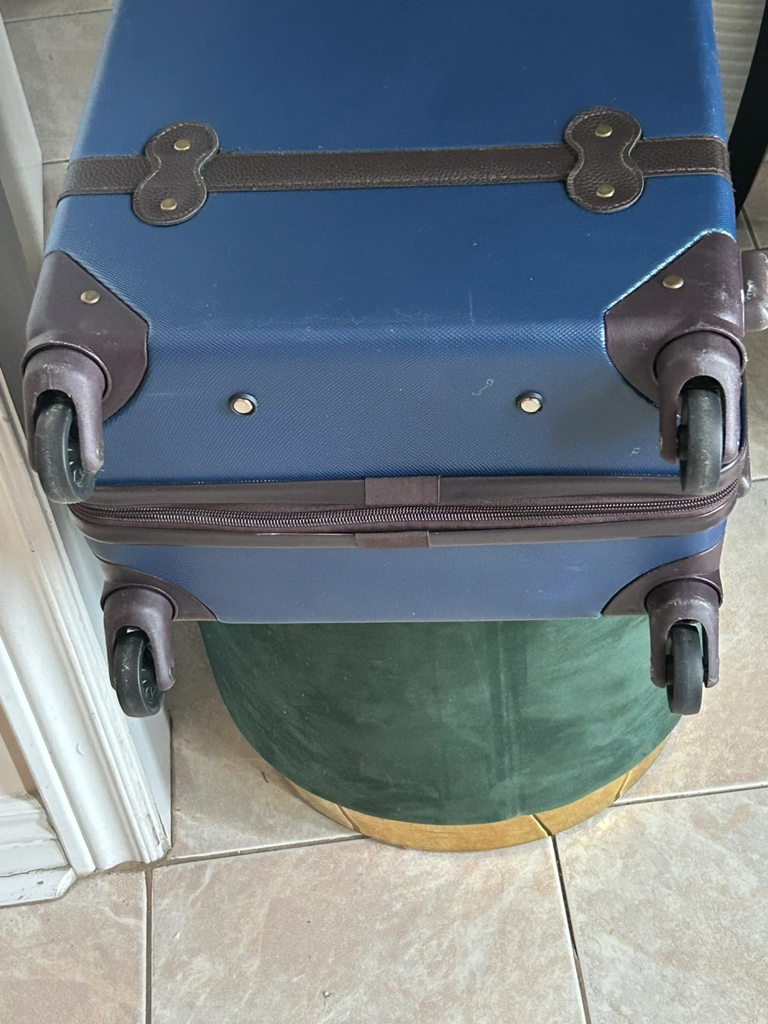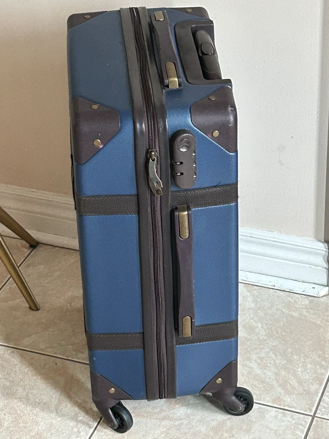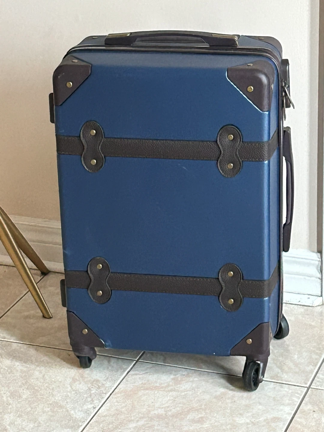 This is a blue hardside carry-on suitcase with brown faux leather trim and accents. It features a retractable handle and four spinner wheels for easy mobility. The luggage has a classic, vintage-inspired design.