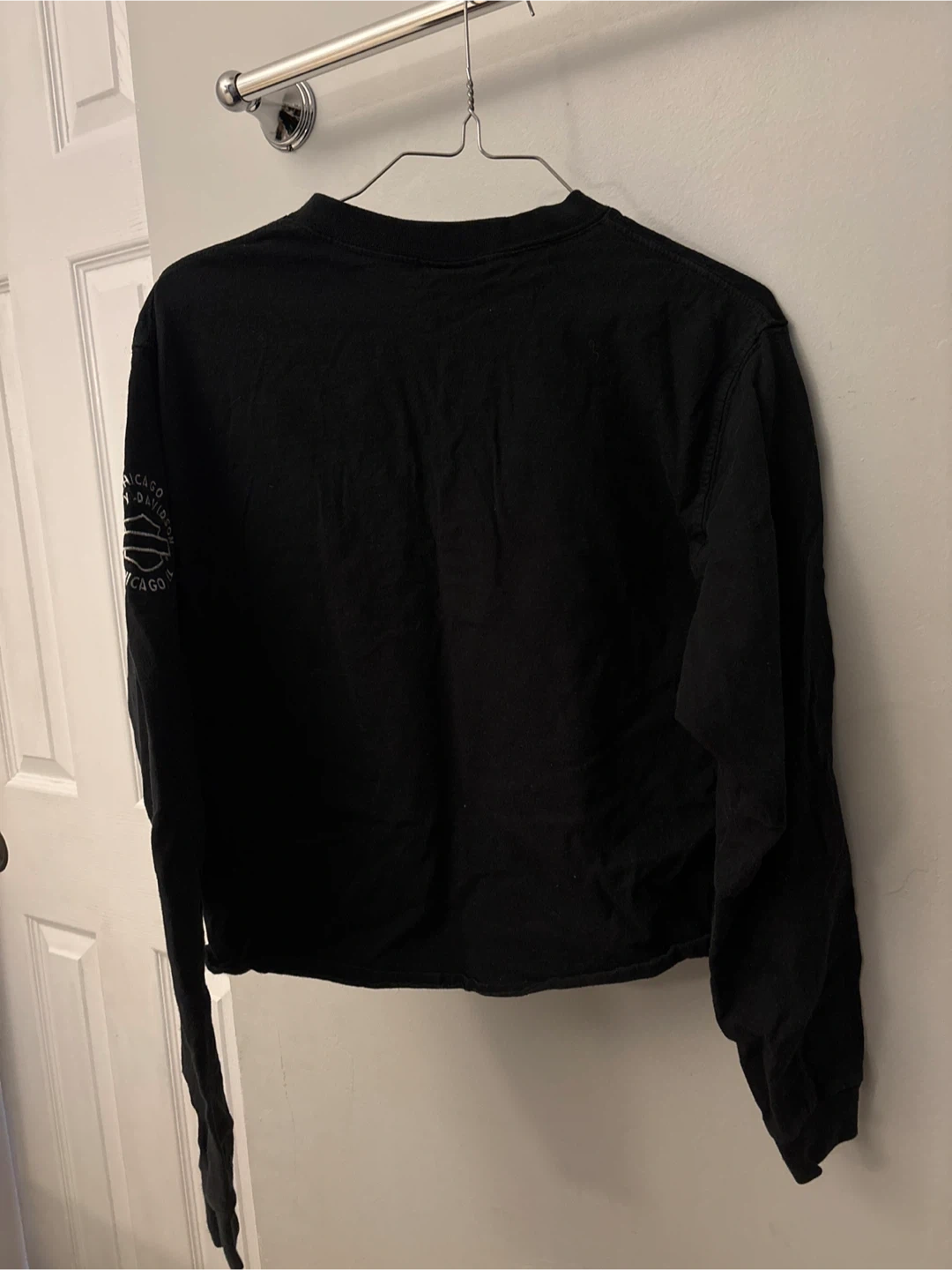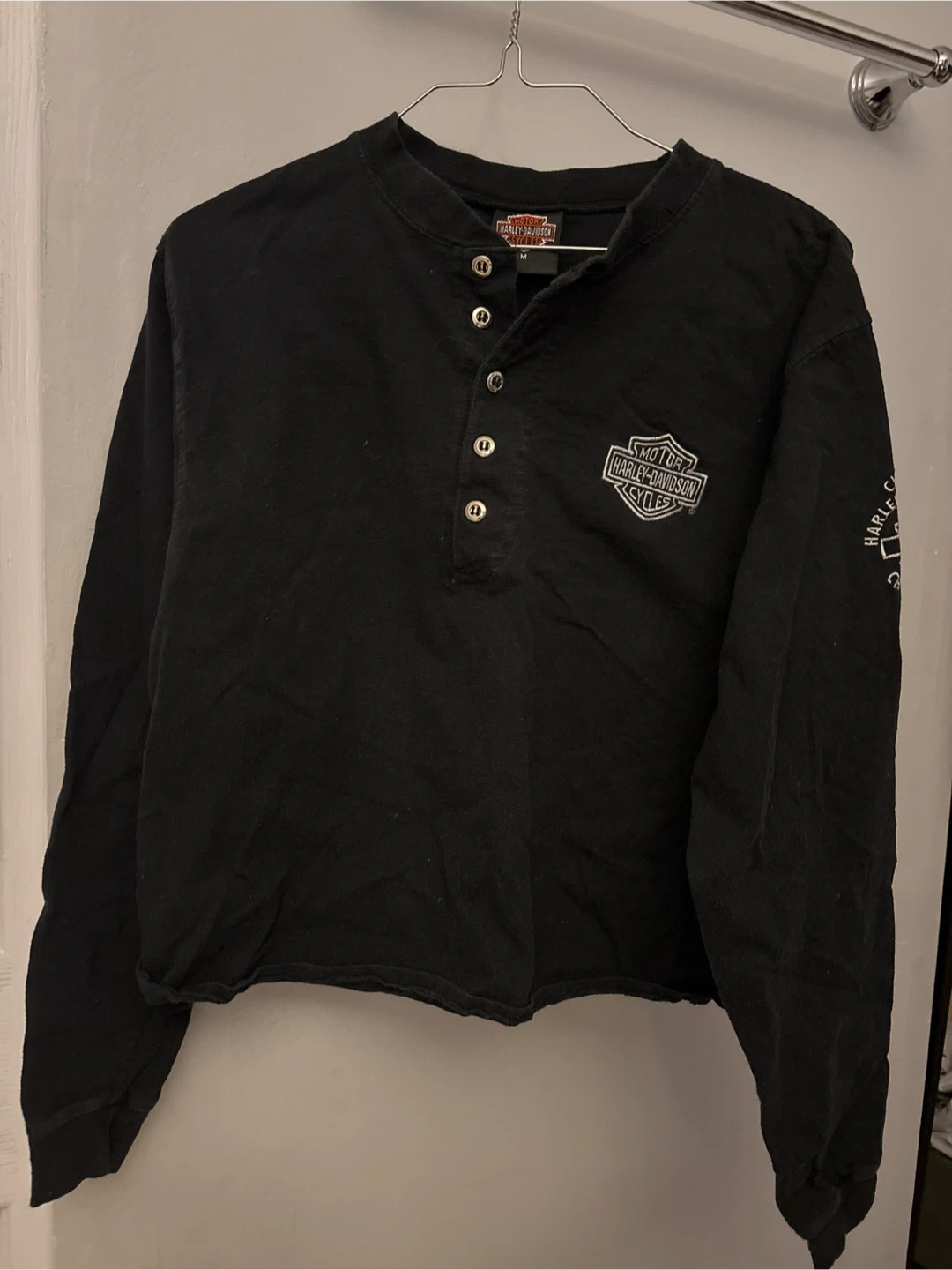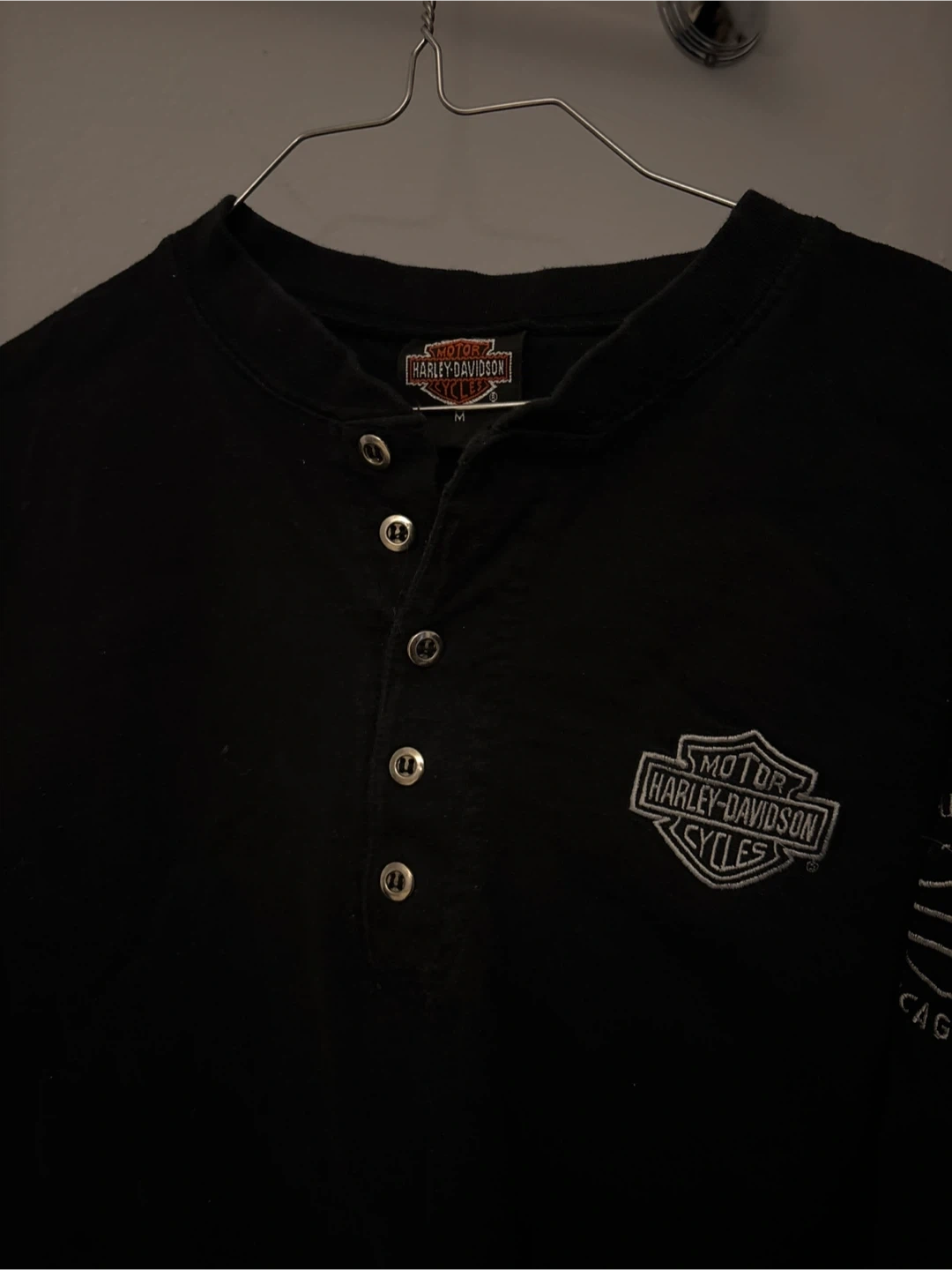 Black Harley-Davidson long sleeve henley shirt with Chicago graphics. It's a size medium. Cotton material.