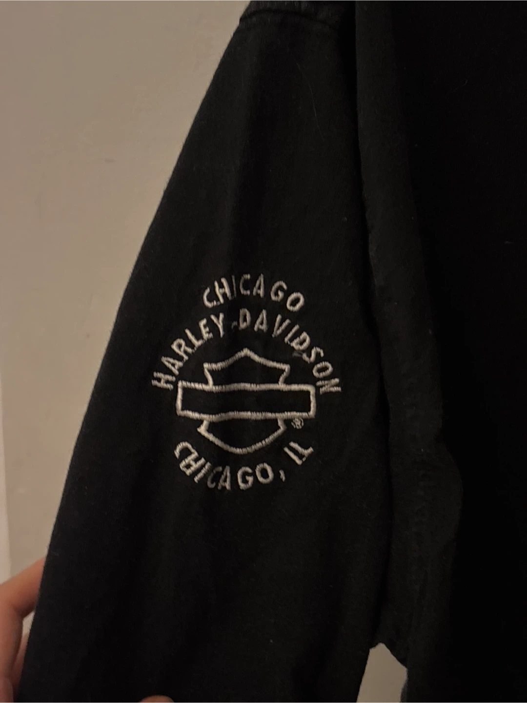 Black Harley-Davidson long sleeve henley shirt with Chicago graphics. It's a size medium. Cotton material.