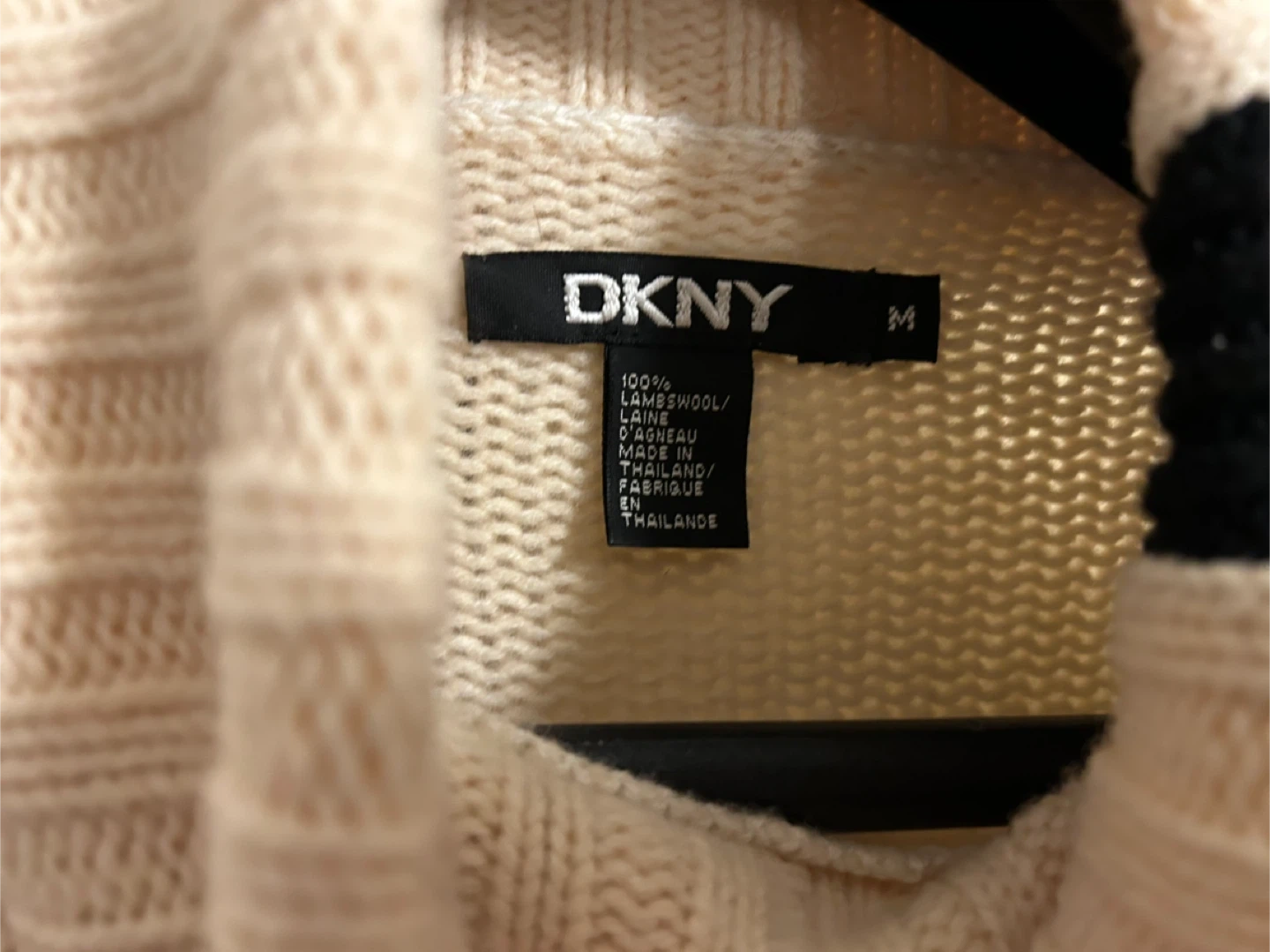 Cozy DKNY turtleneck sweater in a cream colour. It's made from 100% lambswool and features a classic cable knit pattern on the front. Ribbed cuffs and hem, with black trim on the collar and cuffs. Size medium.