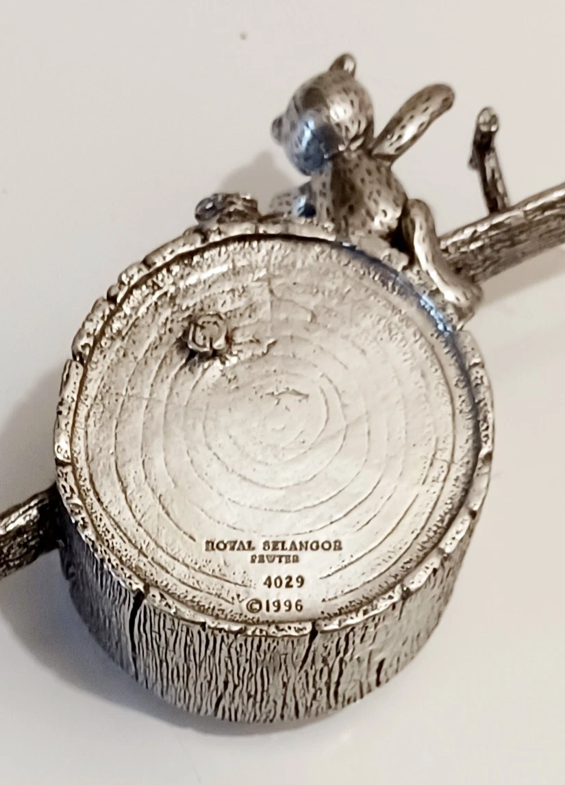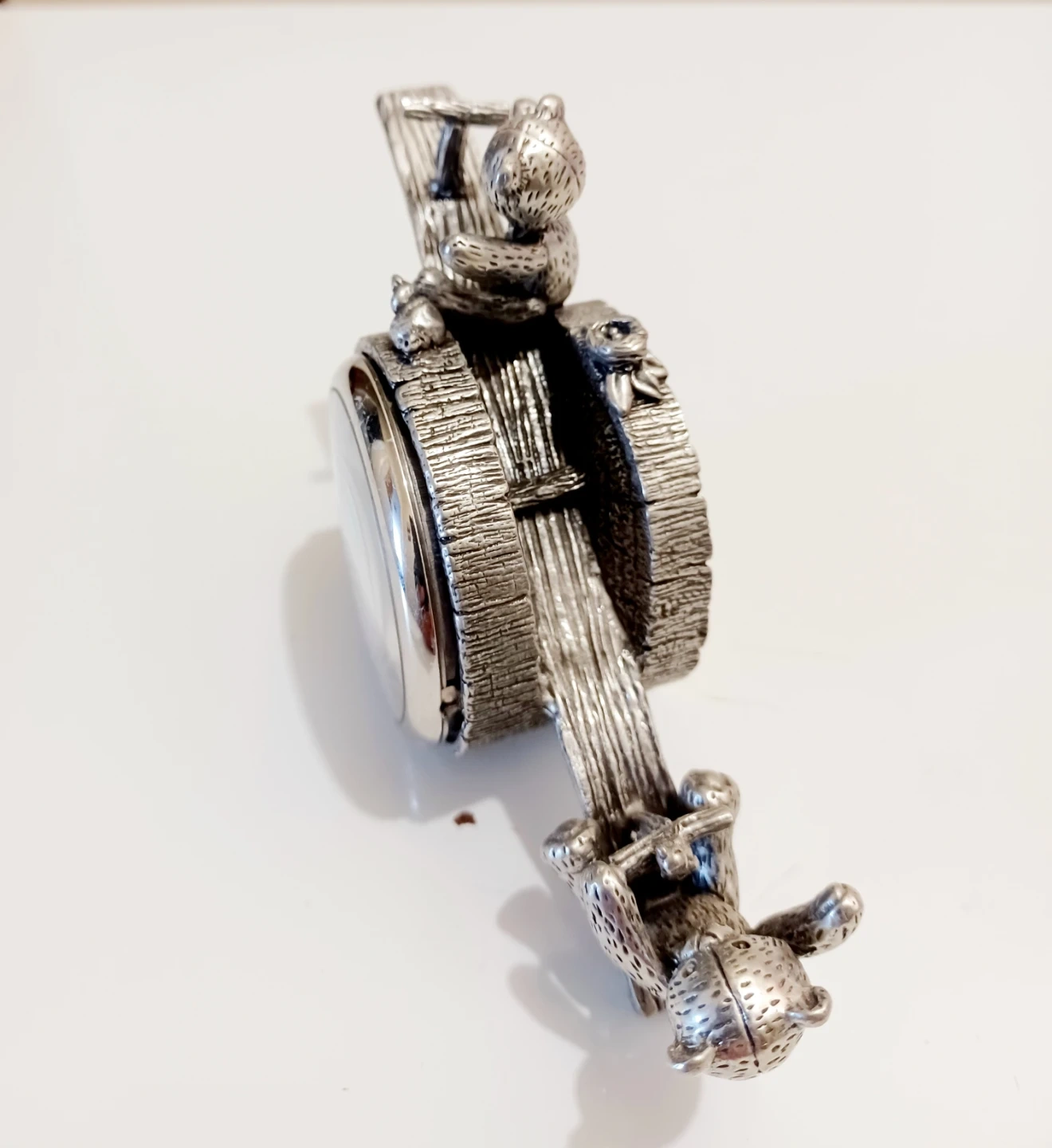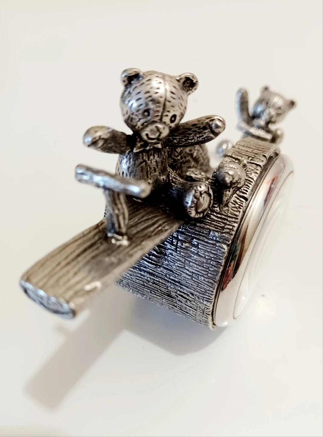 Vtg , Rare Royal Selangor pewter clock featuring adorable teddy bears, perfect for adding a touch of charm to any space! This delightful piece is in very good condition. The clock has a white face with black numbering and a second hand. It features a pewter cast of two teddy bears on a seesaw.