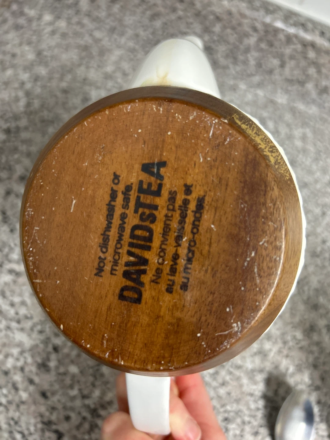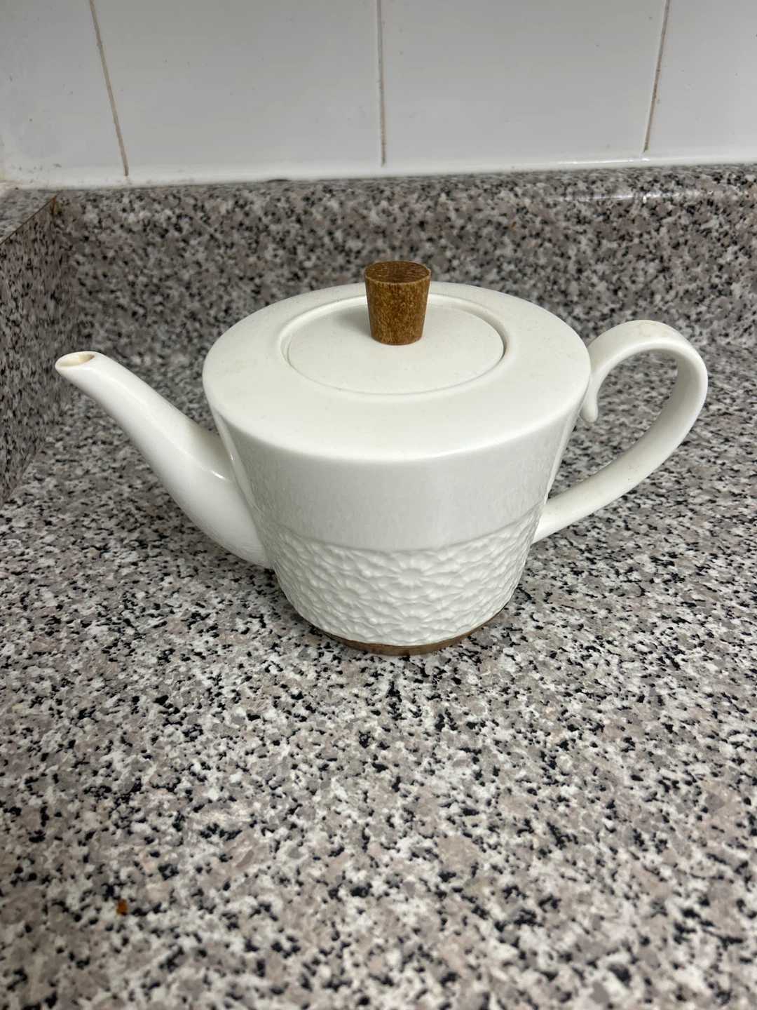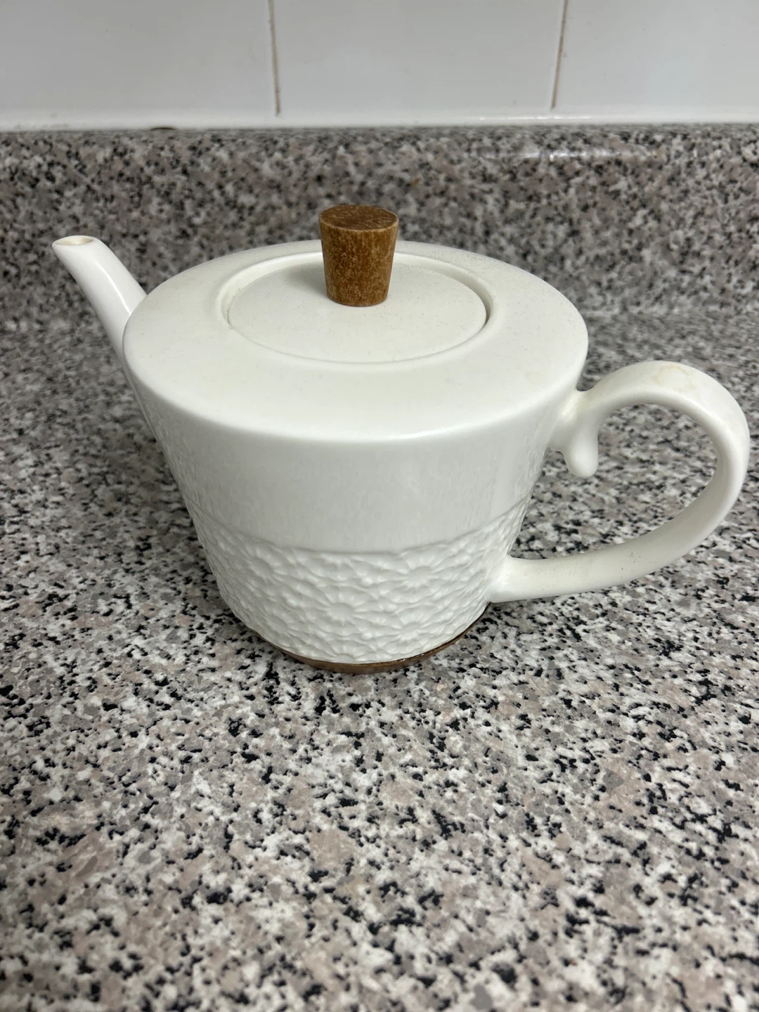 This white ceramic teapot comes from DAVIDsTEA and features a unique textured design around the base. It has a cork lid to keep your tea warm. Not dishwasher or microwave safe.
