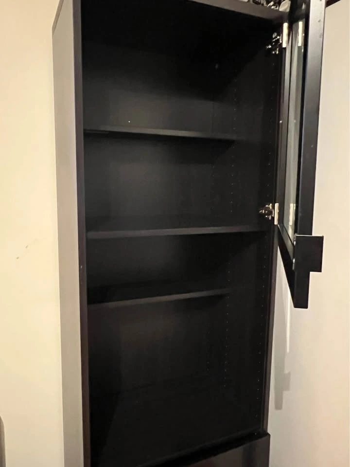 Great condition. Includes 2 doors, one glass and one shiny black, and 4 shelves. Two deep shelves divide into three sections, and there are two smaller shelves.
